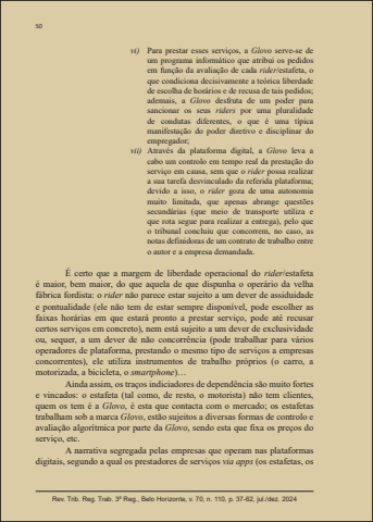 50Rev. Trib. Reg. Trab. 3ª Reg., Belo Horizonte, v. 70, n. 110, p. 37-62, jul./dez. 2024vi) Para prestar esses serviços, a Glovo serve-se de um programa informático que atribui os pedidos em função da avaliação de cada rider/estafeta, o que condiciona decisivamente a teórica liberdade de escolha de horários e de recusa de tais pedidos; ademais, a Glovo desfruta de um poder para sancionar os seus riders por uma pluralidade de condutas diferentes, o que é uma típica manifestação do poder diretivo e disciplinar do empregador;vii) Através da plataforma digital, a Glovo leva a cabo um controlo em tempo real da prestação do serviço em causa, sem que o rider possa realizar a sua tarefa desvinculado da referida plataforma; devido a isso, o rider goza de uma autonomia muito limitada, que apenas abrange questões secundárias (que meio de transporte utiliza e que rota segue para realizar a entrega), pelo que o tribunal concluiu que concorrem, no caso, as notas definidoras de um contrato de trabalho entre o autor e a empresa demandada.É certo que a margem de liberdade operacional do rider/estafeta é maior, bem maior, do que aquela de que dispunha o operário da velha fábrica fordista: o rider não parece estar sujeito a um dever de assiduidade e pontualidade (ele não tem de estar sempre disponível, pode escolher as faixas horárias em que estará pronto a prestar serviço, pode até recusar certos serviços em concreto), nem está sujeito a um dever de exclusividade ou, sequer, a um dever de não concorrência (pode trabalhar para vários operadores de plataforma, prestando o mesmo tipo de serviços a empresas concorrentes), ele utiliza instrumentos de trabalho próprios (o carro, a motorizada, a bicicleta, o smartphone)…Ainda assim, os traços indiciadores de dependência são muito fortes e vincados: o estafeta (tal como, de resto, o motorista) não tem clientes, quem os tem é a Glovo, é esta que contacta com o mercado; os estafetas trabalham sob a marca Glovo, estão sujeitos a diversas formas de controlo e avaliação algorítmica por parte da Glovo, sendo esta que fixa os preços do serviço, etc.A narrativa segregada pelas empresas que operam nas plataformas digitais, segundo a qual os prestadores de serviços via apps (os estafetas, os