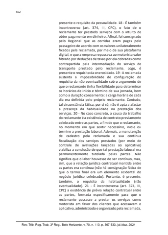 Rev. Trib. Reg. Trab. 3ª Reg., Belo Horizonte, v. 70, n. 110, p. 367-533, jul./dez. 2024502presente o requisito da pessoalidade. 18 - É também incontroverso (art. 374, III, CPC), o fato de o reclamante ter prestado serviços com o intuito de obter pagamento em dinheiro. Afinal, foi consignado pelo Regional que as corridas eram pagas pelo passageiro de acordo com os valores unilateralmente fixados pela reclamada, por meio de sua plataforma digital, e que a empresa repassava ao motorista valor filtrado por deduções de taxas por ela cobradas como contrapartida pela intermediação do serviço de transporte prestado pelo reclamante. Logo, é presente o requisito da onerosidade. 19 - A reclamada sustenta a impossibilidade de configuração do requisito da não eventualidade sob o argumento de que o reclamante tinha flexibilidade para determinar os horários de início e término de sua jornada, bem como a duração concernente: a carga horária de cada dia era definida pelo próprio reclamante. Contudo, tal circunstância fática, por si só, não é apta a afastar a presença da habitualidade na prestação dos serviços. 20 - No caso concreto, a causa do trabalho do reclamante é a existência de contrato previamente celebrado entre as partes, a fim de que o reclamante, no momento em que sentir necessário, inicie ou termine a prestação laboral. Ademais, a manutenção de cadastro pela reclamada e sua contínua fiscalização dos serviços prestados (por meio de controle de avaliações lançadas ao aplicativo) viabiliza a conclusão de que tal prestação laboral era permanentemente tutelada pelas partes. Não significa que o labor houvesse de ser contínuo, mas, sim, que a relação jurídica contratual mantida entre as partes era contínua (não há consignação fática de que o termo final era um elemento acidental do negócio jurídico celebrado). Portanto, é presente, também, o requisito da habitualidade (não eventualidade). 21 - É incontroversa (art. 374, III, CPC) a existência de prévia relação contratual entre as partes, formada especificamente para que o reclamante passasse a prestar os serviços como motorista em favor dos clientes que acessavam o aplicativo, administrado e organizado pela reclamada,