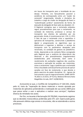 Rev. Trib. Reg. Trab. 3ª Reg., Belo Horizonte, v. 70, n. 110, p. 367-533, jul./dez. 2024503em busca de transporte para a localidade de seu desejo. Portanto, era factualmente possível a existência de contraposição entre um “poder de comando” (organização, direção e disciplina do trabalho a cargo do credor da obrigação de fazer) e “subordinação jurídica” (acatamento da forma de execução da obrigação de fazer pelo seu devedor). 22 - O Regional consignou que a reclamada estipulou regras procedimentais para que o reclamante, na condição de motorista, prestasse o serviço de transporte aos clientes do aplicativo por ela gerenciado. Ainda, é incontroverso (art. 374, III, CPC) o fato de que a reclamada criou e aparelhou o aplicativo de transportes, construindo a plataforma digital e programando os algoritmos que se destinariam a organizar e delinear o serviço de transporte com os parâmetros desejados pela reclamada, na condição de gestora da plataforma. Ainda, depreende-se do contexto fático consignado pelo Regional que a ausência de observância das diretrizes e dos procedimentos (regulamentos) estabelecidos pela reclamada, bem como o recebimento de avaliações negativas dos usuários, acarretava a aplicação de sanções aos motoristas, como o reclamante. Logo, é patente que a reclamada tinha a faculdade contratualmente prevista de aplicar sanções em face do reclamante, o que denota o pleno exercício do poder disciplinar. 23 - Agravo de instrumento a que se nega provimento. (AIRR-10479-76.2022.5.15.0151, 6ª Turma, Relatora Ministra Katia Magalhães Arruda, DEJT 14/08/2023).Acrescente-se que, o Conflito de Competência nº 164.544, citado pela ré, trata da “reparação de danos materiais e morais ajuizada por motorista de aplicativo pretendendo a reativação de sua conta UBER para que possa voltar a usar o aplicativo e realizar seus serviços”, hipótese diversa da retratada nos autos.Por fim, no tocante à Reclamação 59.795/MG, importante registrar que as decisões monocráticas proferidas pelo STF, sem repercussão geral, não possuem efeitos erga omnes e vinculante, não se estendendo a outros processos.