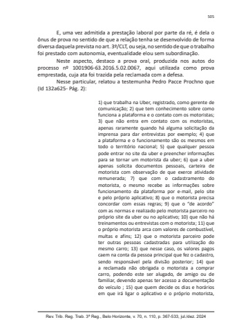Rev. Trib. Reg. Trab. 3ª Reg., Belo Horizonte, v. 70, n. 110, p. 367-533, jul./dez. 2024505E, uma vez admitida a prestação laboral por parte da ré, é dela o ônus de prova no sentido de que a relação tenha se desenvolvido de forma diversa daquela prevista no art. 3º/CLT, ou seja, no sentido de que o trabalho foi prestado com autonomia, eventualidade elou sem subordinação.Neste aspecto, destaco a prova oral, produzida nos autos do processo nº 1001906-63.2016.5.02.0067, aqui utilizada como prova emprestada, cuja ata foi trazida pela reclamada com a defesa.Nesse particular, relatou a testemunha Pedro Pacce Prochno que (Id 132a625- Pág. 2):1) que trabalha na Uber, registrado, como gerente de comunicação; 2) que tem conhecimento sobre como funciona a plataforma e o contato com os motoristas; 3) que não entra em contato com os motoristas, apenas raramente quando há alguma solicitação da imprensa para dar entrevistas por exemplo; 4) que a plataforma e o funcionamento são os mesmos em todo o território nacional; 5) que qualquer pessoa pode entrar no site da uber e preencher informações para se tornar um motorista da uber; 6) que a uber apenas solicita documentos pessoais, carteira de motorista com observação de que exerce atividade remunerada; 7) que com o cadastramento do motorista, o mesmo recebe as informações sobre funcionamento da plataforma por e-mail, pelo site e pelo próprio aplicativo; 8) que o motorista precisa concordar com essas regras; 9) que o “de acordo” com as normas e realizado pelo motorista parceiro no próprio site da uber ou no aplicativo; 10) que não há treinamentos ou entrevistas com o motorista; 11) que o próprio motorista arca com valores de combustível, multas e afins; 12) que o motorista parceiro pode ter outras pessoas cadastradas para utilização do mesmo carro; 13) que nesse caso, os valores pagos caem na conta da pessoa principal que fez o cadastro, sendo responsável pela divisão posterior; 14) que a reclamada não obrigada o motorista a comprar carro, podendo este ser alugado, de amigo ou de familiar, devendo apenas ter acesso a documentação do veículo ; 15) que quem decide os dias e horários em que irá ligar o aplicativo e o próprio motorista,