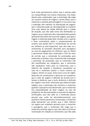Rev. Trib. Reg. Trab. 3ª Reg., Belo Horizonte, v. 70, n. 110, p. 367-533, jul./dez. 2024508local onde permanecera online; que o veículo pode ser compartilhado com outros motoristas, mas todos devem estar cadastrados; que a reclamada não exige um número mínimo de viagens a serem feitas; que o motorista e avaliado pelo passageiro e vice-versa; que a avaliação não interfere na distribuição de viagens; que o motorista pode ser descadastrado se mantiver uma nota abaixo da média definida para a cidade de atuação; que não sabe como são distribuídas as viagens; que o motorista não e descadastrado quando apresenta alto índice de recusa de viagens; que após a viagem o motorista pode fazer contato com o suporte e fazer comentários sobre o comportamento do usuário; que desde 2017 o recebimento da corrida em dinheiro já está disponível; que não sabe se o reclamante já concedeu desconto para passageiro no caso de pagamento em dinheiro; que no UberX o percentual retido pela reclamada e 25% do valor da corrida; que a reclamada faz promoções para motoristas e clientes, mas o motorista não e obrigado a participar da promoção; que os motoristas não são classificados em categorias; que a reclamada não estabelece meta para os motoristas; que o UberPro diz respeito a benefícios concedidos no caso de o motorista realizar o maior número de viagens, dentre os quais, bolsa para curso de inglês, desconto em combustível e desconto em academia; que o valor da viagem e definido de acordo com o tempo e distância; que a tarifa dinâmica é definida por região e visa atrair motoristas para determinadas regiões; que a reclamada não monitora o motorista quando o aplicativo está desativado; que o motorista fica impossibilitado de fazer viagens no caso de problemas de documentação ou quando há algumas verificações; que não sabe se a reclamada possui pessoal que cuida do descredenciamento; que quando o cliente apresenta a reclamação, o motorista pode apresentar sua versão; que a Uber oferece um seguro por acidentes pessoais para o motorista e passageiro; que a reclamada não exige que o motorista contrate seguro; que não sabe se já houve reclamação em relação ao reclamante; que não sabe