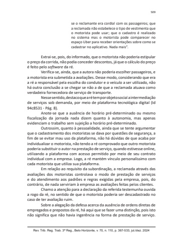 Rev. Trib. Reg. Trab. 3ª Reg., Belo Horizonte, v. 70, n. 110, p. 367-533, jul./dez. 2024509se o reclamante era cordial com os passageiros; que a reclamada não estabelece o tipo de vestimenta que o motorista pode usar; que o cadastro é realizado no sistema mas o motorista pode comparecer no espaço Uber para receber orientações sobre como se cadastrar no aplicativo. Nada mais”.Extrai-se, pois, do informado, que o motorista não poderia estipular o preço da corrida, não podia conceder descontos, já que o cálculo do preço é feito pelo software da ré.Verifica-se, ainda, que a autora não poderia escolher passageiros, e a motorista era submetida a avaliações. Desse modo, considerando que era a ré a responsável pela escolha do condutor e o veículo a ser utilizado, não há outra conclusão a se chegar se não a de que a reclamada atuava como verdadeira fornecedora de serviço de transporte.Nesse sentido, destaco que a ré tem por objeto social a intermediação de serviços sob demanda, por meio de plataforma tecnológica digital (Id 94c8531 - Pág. 8).Anote-se que a ausência de horário pré-determinado ou mesmo fiscalização da jornada nada dizem quanto à autonomia, mas apenas evidenciam o trabalho sem sujeição a horário pré-determinado.Outrossim, quanto à pessoalidade, ainda que se tente argumentar que o cadastramento dos motoristas se dava por questões de segurança, a fim de se evitar mau uso da plataforma, não há dúvidas de que acaba por individualizar o motorista, não tendo a ré comprovado que outro motorista poderia substituir o autor na prestação de serviço, quando estivesse online, utilizando a plataforma com acesso permitido por meio de seu contrato individual com a empresa. Logo, a ré mantém vínculo personalíssimo com cada motorista que utiliza sua plataforma.Em relação ao requisito da subordinação, a reclamada através das avaliações dos motoristas controlava o modo de prestação de serviços e do atendimento aos padrões e regras exigidas pela empresa, pois, do contrário, de nada serviriam à empresa as avaliações feitas pelos clientes.Chamo a atenção para a declaração da referida testemunha ouvida a rogo da ré, no sentido de que o motorista poderia ser descadastrado no caso de ter avaliação ruim.Sobre a alegação da defesa acerca da ausência de ordens diretas de empregados e prepostos da ré, há aqui que se fazer uma distinção, pois isto não significa que não havia ingerência na forma de prestação de serviço.