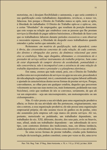 51Rev. Trib. Reg. Trab. 3ª Reg., Belo Horizonte, v. 70, n. 110, p. 37-62, jul./dez. 2024motoristas, etc.) desejam flexibilidade e autonomia, o que seria contrário à sua qualificação como trabalhadores dependentes, revela-se, a nosso ver, falaciosa. Isto porque o Direito do Trabalho nunca se opôs, nem se opõe, à liberdade do trabalhador. O Direito do Trabalho opôs-se e opõe-se, sim, a certas “liberdades” do empregador, que resultam da posição dominante que este ocupa na relação que estabelece com as pessoas que lhe prestam serviços (a liberdade de pagar salários baixíssimos, a liberdade de fazer com que os trabalhadores laborem durante períodos excessivos e sem observar o necessário repouso, a liberdade de despedir esses trabalhadores quando entender e pelas razões que entender, etc.).Reiteramos: em matéria de qualificação, tudo dependerá, comoé óbvio, das circunstâncias concretas de cada relação, de cada contrato,dos direitos e obrigações das partes, da dinâmica relacional que entreelas se estabeleça. Mas, aqui chegados, afirmamos: a circunstância de oprestador de serviço utilizar instrumentos de trabalho próprios, bem comode estar dispensado de cumprir deveres de assiduidade, pontualidade enão concorrência, não é incompatível com a existência de uma relação detrabalho dependente entre o prestador e a plataforma eletrónica.Em suma, cremos que tudo estará, pois, em o Direito do Trabalho acolher estes novos prestadores de serviços via apps no seu seio, procedendo à devida adaptação regimental, isto é, construindo um regime laboral calibrado e ajustado às características destas novas formas de prestar serviços. Porque, convenhamos, ao olhar para um qualquer estafeta, daqueles que percorrem velozmente as ruas nas suas motos (ou, mais lentamente, pedalando nas suas bicicletas), creio que nenhum de nós se convence, seriamente, de que ali vai um empresário - seja um microempresário, um motoempresário ou um cicloempresário…Não. O rider presta a sua atividade para uma organização produtiva alheia; os frutos da sua atividade não lhe pertencem, originariamente, mas sim a outrem, a essa organização produtiva; ele não possui uma organização empresarial própria; ele não assume riscos de ganhos ou de perdas, estes são assumidos pela empresa sob cuja marca ele presta serviços. Ali vai, portanto, motorizado ou pedalando, um trabalhador dependente, um trabalhador do séc. XXI, diferente, decerto, dos seus pais, avós ou bisavós, mas, afinal, ainda um trabalhador dependente - um subordinado de novo tipo, com contornos distintos dos tradicionais, mas, em última instância, ainda dependente e subordinado na forma como desenvolve a sua atividade.Se estas novas formas de prestar trabalho, criadas pela fantástica evolução da tecnologia, podem constituir, como por vezes se diz, uma terra
