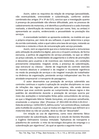 Rev. Trib. Reg. Trab. 3ª Reg., Belo Horizonte, v. 70, n. 110, p. 367-533, jul./dez. 2024511Assim, sobre os requisitos da relação de emprego (pessoalidade, não eventualidade, onerosidade e subordinação, conforme análise combinada dos artigos 2º e 3º da CLT), concluo que a investigação quanto à presença da pessoalidade não oferece dificuldade, pois no processo de cadastramento do motorista, a ré identifica o profissional e a cada chamada realizada, a identificação do motorista (seja por nome, foto, ou ambas) é apresentada ao usuário, evidenciando a pessoalidade na prestação dos serviços.A onerosidade também se apresenta evidente, na medida em que a própria empresa, por meio de seu software, é quem determina o preço da corrida contratada, sobre a qual cobra uma taxa de serviços, restando ao motorista o restante a título de remuneração pelo serviço prestado.Assim, nem se argumente que era o motorista quem a remunerava pela utilização da plataforma digital, pois era a ré quem conduzia, de forma exclusiva, a política de pagamento do serviço prestado, no que se refere ao preço cobrado, às modalidades de pagamento e à oferta de promoções e descontos para usuários e de incentivos aos motoristas, em condições previamente estipuladas. Inegável, ainda, a presença da subordinação, seja estrutural ou clássica - diante de magnitude do controle exercido de maneira absoluta e unilateral e da inegável e inconteste ingerência no modo da prestação de serviços e da inegável inserção do trabalhador na dinâmica da organização, prestando serviço indispensável aos fins da atividade empresarial: o transporte de passageiros.O autor desenvolvia sua prestação de serviços submetido aos controles contínuos e sujeito à aplicação de sanções disciplinares no caso de infrações das regras estipuladas pela empresa, não sendo demais lembrar que esse controle quanto ao cumprimento dessas regras e dos padrões de atendimento durante a prestação de serviços ocorria por meio das avaliações e reclamações feitas pelos consumidores do serviço, ao que o Magistrado Márcio Toledo Gonçalves, em processo semelhante, envolvendo a empresa Uber (Processo nº 0011359-34.2016.5.03.0112 - Data da sentença: 13/02/2017), definiu como “um controle difuso, realizado pela multidão de usuários, e que se traduz em algoritmos que definem se o motorista deve ou não ser punido, deve ou não ser ‘descartado”.Em relação ao uso de algoritmos, como novo elemento fático caracterizador da subordinação, destaca-se o estudo de Daniela Muradas e Eugênio Delmaestro Corassa intitulado “Aplicativos de transporte e plataforma de controle: o mito da tecnologia disruptiva do emprego e a subordinação por algoritmos”, do qual se aponta o seguinte trecho: