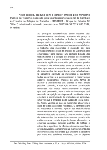 Rev. Trib. Reg. Trab. 3ª Reg., Belo Horizonte, v. 70, n. 110, p. 367-533, jul./dez. 2024514Neste sentido, coaduno com o parecer emitido pelo Ministério Público do Trabalho elaborado pela Coordenadoria Nacional de Combate às Fraudes na Relação de Trabalho - CONAFRET - Grupo de Estudos GE “Uber”, extraído dos autos do processo de n. 0011354-30.2015.5.03.0182, in verbis:As principais características desse sistema são: monitoramento eletrônico, aumento de preço e programação de trabalho, a fusão da análise em tempo real com a análise prévia e a avaliação dos motoristas. Em relação ao monitoramento eletrônico, o trabalho dos motoristas é moldado por dois principais fatores: o uso de práticas de vigilância pelo empregador para realizar um controle brando dos trabalhadores e a adoção de práticas de resistência pelos motoristas para enfrentar esse sistema. A constante vigilância promovida pela empresa produz assimetrias de informações entre os motoristas e a Uber, que acessa e controla uma grande quantidade de informações das experiências dos trabalhadores. O aplicativo estimula os motoristas a aceitarem todas as corridas e a permanecerem o maior tempo possível trabalhando. Trata-se de uma forma de manter o atendimento aos clientes o mais amplo possível. Contudo, a aceitação de uma corrida pelo motorista não indica necessariamente o trajeto que será percorrido, nem o valor estimado que será recebido. A rejeição de viagens não rentáveis coloca em risco a continuidade do motorista no aplicativo, uma vez que a empresa pode suspendê-lo ou excluílo. Assim, verifica-se que os motoristas absorvem o risco de todas as corridas realizadas. O controle sobre os motoristas é elevado. Apesar dos trabalhadores serem remunerados apenas quando realizam viagens demandadas pelo aplicativo, a Uber mantém a coleta de informações dos motoristas mesmo quando não estão em uma corrida. A partir desses elementos, a empresa consegue delinear padrões de tráfego e alimenta o algoritmo de oferta e demanda que fixa o preço das viagens. A Uber iniciou o monitoramento dos movimentos dos motoristas que utilizam o aplicativo por meio dos telefones celulares, com o objetivo