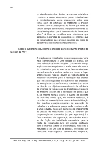Rev. Trib. Reg. Trab. 3ª Reg., Belo Horizonte, v. 70, n. 110, p. 367-533, jul./dez. 2024516no atendimento dos clientes, a empresa estabelece condutas a serem observadas pelos trabalhadores e constantemente envia mensagens sobre esse tema, além de estimular os motoristas a criarem relações com os passageiros de forma que estes se sintam sempre confortáveis, independentemente da situação daqueles - que é denominado de “emotional labor”. A Uber se considera uma plataforma que aproxima motoristas de passageiros e entende que os trabalhadores que prestam serviços por meio do aplicativo são contratados independentes.Sobre a subordinação, chamo a atenção para o seguinte trecho do Parecer do MPT:A relação entre trabalhador e empresa passa por uma nova nomenclatura: é uma relação de aliança, em uma refeudalização das relações. O liame da aliança implica em um engajamento ainda maior da pessoa do trabalhador, pois ao invés de se fixar em obedecer mecanicamente a ordens dadas em tempo e lugar anteriormente fixados, devem os trabalhadores se mobilizar totalmente para a realização dos objetos que lhe são consignados e se submeter aos processos de avaliação de sua performance. Também é essencial na direção por objetivos o crescimento da influência da empresa na vida pessoal do trabalhador. É próprio do trabalho assalariado a reificação da pessoa que é, ao mesmo tempo, objeto e sujeito do contrato de trabalho, sendo que, de maneira recíproca, é reconhecida sua condição de pessoa. A desestabilização dos quadros espaços-temporais de execução do trabalho e a autonomia programada conduzem não a uma redução, mas a um aumento do engajamento da pessoa do trabalhador. Assim, o controle por programação ou comandos (ou por algoritmo) é a faceta moderna da organização do trabalho. Passase da ficção do trabalhador-mercadoria para a ficção do trabalhador-livre, em aliança neofeudal com a empresa. Altera-se a formatação, mas resta a natureza: a) de um lado as pessoas, travestidas em realidades intersubjetivas denominadas empresas,