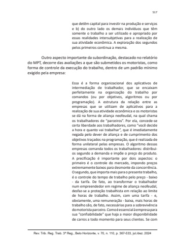 Rev. Trib. Reg. Trab. 3ª Reg., Belo Horizonte, v. 70, n. 110, p. 367-533, jul./dez. 2024517que detêm capital para investir na produção e serviços e b) do outro lado os demais indivíduos que têm somente o trabalho a ser utilizado e apropriado por essas realidades intersubjetivas para a realização de sua atividade econômica. A exploração dos segundos pelos primeiros continua a mesma.Outro aspecto importante da subordinação, destacado no relatório do MPT, decorre das avaliações a que são submetidos os motoristas, como forma de controle da execução do trabalho, dentro de um padrão mínimo exigido pela empresa:Essa é a forma organizacional dos aplicativos de intermediação de trabalhador, que se encaixam perfeitamente na organização do trabalho por comandos (ou por objetivos, algoritmos ou por programação). A estrutura da relação entre as empresas que se utilizam de aplicativos para a realização de sua atividade econômica e os motoristas se dá na forma de aliança neofeudal, na qual chama os trabalhadores de “parceiros”. Por ela, concede-se certa liberdade aos trabalhadores, como “você decide a hora e quanto vai trabalhar”, que é imediatamente negada pelo dever de aliança e de cumprimento dos objetivos traçados na programação, que é realizada de forma unilateral pelas empresas. O algoritmo dessas empresas comanda todos os trabalhadores: distribuios segundo a demanda e impõe o preço do produto. A precificação é importante por dois aspectos: o primeiro é o controle do mercado, impondo preços extremamente baixos para desmonte da concorrência. O segundo, que importa mais para o presente trabalho, é o controle do tempo de trabalho pelo preço - baixo - da tarifa. De fato, ao transformar o trabalhador num empreendedor em regime de aliança neofeudal, desfaz-se a proteção trabalhista em relação ao limite de horas de trabalho. Assim, com uma tarifa - e, obviamente, uma remuneração - baixa, mais horas de trabalho são, de fato, necessárias para a sobrevivência do motorista parceiro. Como é essencial à empresa para sua “confiabilidade” que haja a maior disponibilidade de carros a todo momento para seus clientes. Se com