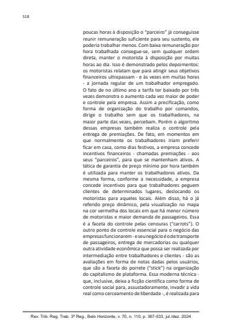 Rev. Trib. Reg. Trab. 3ª Reg., Belo Horizonte, v. 70, n. 110, p. 367-533, jul./dez. 2024518poucas horas à disposição o “parceiro” já conseguisse reunir remuneração suficiente para seu sustento, ele poderia trabalhar menos. Com baixa remuneração por hora trabalhada consegue-se, sem qualquer ordem direta, manter o motorista à disposição por muitas horas ao dia. Isso é demonstrado pelos depoimentos: os motoristas relatam que para atingir seus objetivos financeiros ultrapassam - e às vezes em muitas horas - a jornada regular de um trabalhador empregado. O fato de no último ano a tarifa ter baixado por três vezes demonstra o aumento cada vez maior de poder e controle pela empresa. Assim a precificação, como forma de organização do trabalho por comandos, dirige o trabalho sem que os trabalhadores, na maior parte das vezes, percebam. Porém o algoritmo dessas empresas também realiza o controle pela entrega de premiações. De fato, em momentos em que normalmente os trabalhadores iriam preferir ficar em casa, como dias festivos, a empresa concede incentivos financeiros - chamadas premiações - aos seus “parceiros”, para que se mantenham ativos. A tática de garantia de preço mínimo por hora também é utilizada para manter os trabalhadores ativos. Da mesma forma, conforme a necessidade, a empresa concede incentivos para que trabalhadores peguem clientes de determinados lugares, deslocando os motoristas para aqueles locais. Além disso, há o já referido preço dinâmico, pela visualização no mapa na cor vermelha dos locais em que há menor número de motoristas e maior demanda de passageiros. Essa é a faceta do controle pelas cenouras (“carrots”). O outro ponto de controle essencial para o negócio das empresas funcionarem - e seu negócio é o de transporte de passageiros, entrega de mercadorias ou qualquer outra atividade econômica que possa ser realizada por intermediação entre trabalhadores e clientes - são as avaliações em forma de notas dadas pelos usuários, que são a faceta do porrete (“stick”) na organização do capitalismo de plataforma. Essa moderna técnica - que, inclusive, deixa a ficção científica como forma de controle social para, assustadoramente, invadir a vida real como cerceamento de liberdade -, é realizada para