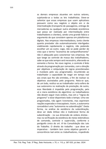Rev. Trib. Reg. Trab. 3ª Reg., Belo Horizonte, v. 70, n. 110, p. 367-533, jul./dez. 2024520as demais empresas atuantes em outros setores, sujeitando-se a todas as leis trabalhistas. Deve-se salientar que essas empresas que usam aplicativos possuem como seu negócio o objeto em si da intermediação (transporte de passageiros, entrega de mercadorias ou qualquer outra atividade econômica que possa ser realizada por intermediação entre trabalhadores e clientes), sendo uma grande falácia o argumento de que consistem apenas em plataformas digitais. Nas empresas intermediadoras, tanto cliente quanto prestador são automaticamente interligados viabilizando rapidamente o negócio, não podendo escolher um ao outro. Logo, não se pode perder de vista que o termo “economia de compartilhamento” não é adequado para caracterizar tais empresas. No que tange ao controle de massa dos trabalhadores, sabe-se que este sempre será necessário, alterando-se somente a forma. No novo regime, o controle é feito através da programação por comandos, com a direção por objetivos e estipulação de regras preordenadas e mutáveis pelo seu programador, incumbindo ao trabalhador a capacidade de reagir em tempo real aos sinais que lhe são emitidos, a fim de realizar os objetivos assinalados pelo programa. Nota-se que, de um lado, restitui-se ao trabalhador certa esfera de sua autonomia na realização da prestação; de outro, essa liberdade é impedida pela programação, pela só e mera existência do algoritmo: os trabalhadores não devem seguir mais ordens, mas sim a “regras do programa” e estar disponíveis todo o tempo. Uma vez programados, não agem livremente, mas exprimem reações esperadas e inescapáveis. Assim, a autonomia concedida é uma “autonomia na subordinação”. Desta forma, na análise da existência da subordinação, deve ser dada ênfase não à tradicional forma de subordinação - na sua dimensão de ordens diretas - mas na verificação da existência de meios telemáticos de comando, controle e supervisão, conforme o parágrafo único do art. 60 da Consolidação das Leis do Trabalho. O direito do trabalho - que deve ser imperativo - também tem como objetivo garantir a concorrência leal entre os trabalhadores, impedindo