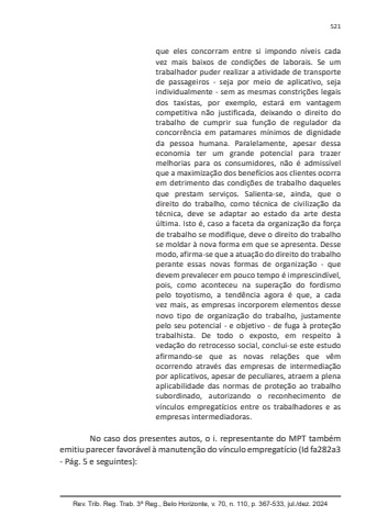 Rev. Trib. Reg. Trab. 3ª Reg., Belo Horizonte, v. 70, n. 110, p. 367-533, jul./dez. 2024521que eles concorram entre si impondo níveis cada vez mais baixos de condições de laborais. Se um trabalhador puder realizar a atividade de transporte de passageiros - seja por meio de aplicativo, seja individualmente - sem as mesmas constrições legais dos taxistas, por exemplo, estará em vantagem competitiva não justificada, deixando o direito do trabalho de cumprir sua função de regulador da concorrência em patamares mínimos de dignidade da pessoa humana. Paralelamente, apesar dessa economia ter um grande potencial para trazer melhorias para os consumidores, não é admissível que a maximização dos benefícios aos clientes ocorra em detrimento das condições de trabalho daqueles que prestam serviços. Salienta-se, ainda, que o direito do trabalho, como técnica de civilização da técnica, deve se adaptar ao estado da arte desta última. Isto é, caso a faceta da organização da força de trabalho se modifique, deve o direito do trabalho se moldar à nova forma em que se apresenta. Desse modo, afirma-se que a atuação do direito do trabalho perante essas novas formas de organização - que devem prevalecer em pouco tempo é imprescindível, pois, como aconteceu na superação do fordismo pelo toyotismo, a tendência agora é que, a cada vez mais, as empresas incorporem elementos desse novo tipo de organização do trabalho, justamente pelo seu potencial - e objetivo - de fuga à proteção trabalhista. De todo o exposto, em respeito à vedação do retrocesso social, conclui-se este estudo afirmando-se que as novas relações que vêm ocorrendo através das empresas de intermediação por aplicativos, apesar de peculiares, atraem a plena aplicabilidade das normas de proteção ao trabalho subordinado, autorizando o reconhecimento de vínculos empregatícios entre os trabalhadores e as empresas intermediadoras.No caso dos presentes autos, o i. representante do MPT também emitiu parecer favorável à manutenção do vínculo empregatício (Id fa282a3 - Pág. 5 e seguintes):
