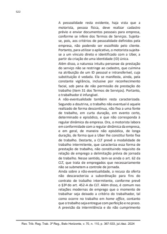 Rev. Trib. Reg. Trab. 3ª Reg., Belo Horizonte, v. 70, n. 110, p. 367-533, jul./dez. 2024522A pessoalidade resta evidente, haja vista que a motorista, pessoa física, deve realizar cadastro prévio e enviar documentos pessoais para empresa, conforme se infere dos Termos de Serviços. Sujeitase, pois, aos critérios de pessoalidade definidos pela empresa, não podendo ser escolhido pelo cliente. Portanto, para utilizar o aplicativo, o motorista sujeitase a um vínculo direto e identificado com a Uber, a partir da criação de uma identidade (ID) única.Além disso, a natureza intuitu personae da prestação do serviço não se restringe ao cadastro, que culmina na atribuição de um ID pessoal e intransferível, cuja substituição é vedada. Ela se manifesta, ainda, pela constante vigilância, inclusive por reconhecimento facial, sob pena de não permissão de prestação do trabalho (item 31 dos Termos de Serviços). Portanto, o trabalhador é infungível.A não-eventualidade também resta caracterizada. Segundo a doutrina, o trabalho não eventual é aquele realizado de forma descontínua, não fixa a uma fonte de trabalho, em curta duração, em evento certo, determinado e episódico, e que não corresponda à regular dinâmica da empresa. Ora, o motorista labora em conformidade com a regular dinâmica da empresa, e em geral, de maneira não episódica, de longa duração, de forma que a Uber lhe constitui fonte fixa de trabalho. Destarte, a CLT prevê a modalidade de trabalho intermitente, que caracteriza essa forma de prestação de trabalho, não constituindo requisito da relação de emprego a delimitação prévia de jornada de trabalho. Nesse sentido, tem-se ainda o art. 62 da CLT, que trata de empregados que necessariamente não se submetem a controle de jornada.Ainda sobre a não-eventualidade, a recusa da oferta não descaracteriza a subordinação para fins do contrato de trabalho intermitente, conforme prevê o §3º do art. 452-A da CLT. Além disso, é comum nas relações modernas de emprego que o momento de trabalhar seja deixado a critério do trabalhador, tal como ocorre no trabalho em home office, contanto que o trabalho seja entregue com perfeição e no prazo. A previsão da intermitência e do não cumprimento