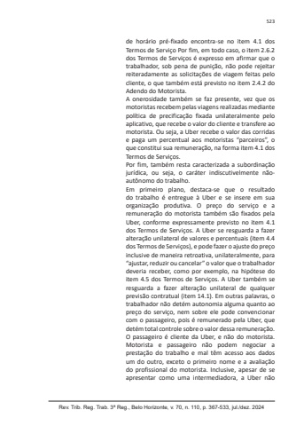 Rev. Trib. Reg. Trab. 3ª Reg., Belo Horizonte, v. 70, n. 110, p. 367-533, jul./dez. 2024523de horário pré-fixado encontra-se no item 4.1 dos Termos de Serviço Por fim, em todo caso, o item 2.6.2 dos Termos de Serviços é expresso em afirmar que o trabalhador, sob pena de punição, não pode rejeitar reiteradamente as solicitações de viagem feitas pelo cliente, o que também está previsto no item 2.4.2 do Adendo do Motorista.A onerosidade também se faz presente, vez que os motoristas recebem pelas viagens realizadas mediante política de precificação fixada unilateralmente pelo aplicativo, que recebe o valor do cliente e transfere ao motorista. Ou seja, a Uber recebe o valor das corridas e paga um percentual aos motoristas “parceiros”, o que constitui sua remuneração, na forma item 4.1 dos Termos de Serviços.Por fim, também resta caracterizada a subordinação jurídica, ou seja, o caráter indiscutivelmente nãoautônomo do trabalho.Em primeiro plano, destaca-se que o resultado do trabalho é entregue à Uber e se insere em sua organização produtiva. O preço do serviço e a remuneração do motorista também são fixados pela Uber, conforme expressamente previsto no item 4.1 dos Termos de Serviços. A Uber se resguarda a fazer alteração unilateral de valores e percentuais (item 4.4 dos Termos de Serviços), e pode fazer o ajuste do preço inclusive de maneira retroativa, unilateralmente, para “ajustar, reduzir ou cancelar” o valor que o trabalhador deveria receber, como por exemplo, na hipótese do item 4.5 dos Termos de Serviços. A Uber também se resguarda a fazer alteração unilateral de qualquer previsão contratual (item 14.1). Em outras palavras, o trabalhador não detém autonomia alguma quanto ao preço do serviço, nem sobre ele pode convencionar com o passageiro, pois é remunerado pela Uber, que detém total controle sobre o valor dessa remuneração.O passageiro é cliente da Uber, e não do motorista. Motorista e passageiro não podem negociar a prestação do trabalho e mal têm acesso aos dados um do outro, exceto o primeiro nome e a avaliação do profissional do motorista. Inclusive, apesar de se apresentar como uma intermediadora, a Uber não