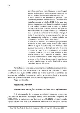 Rev. Trib. Reg. Trab. 3ª Reg., Belo Horizonte, v. 70, n. 110, p. 367-533, jul./dez. 2024524permite a escolha do motorista ou do passageiro, pois a alocação do serviço é processada pelo algoritmo com vistas à máxima eficiência da atividade econômica.A mera utilização de ferramentas próprias, pelo trabalhador, também não caracteriza a autonomia do trabalho, vez que o trabalho BYOD (bring your own device - traga seu próprio dispositivo ou instrumento), é hoje prática extremamente comum no âmbito de corporações que utilizam bases tecnológicas no desenvolvimento de suas atividades, o que em nenhum caso se presta a desnaturar o vínculo de emprego. A título de exemplo, tem-se expressa previsão de uso de equipamentos próprios na regulamentação do teletrabalho, na forma do art. 75-D da CLT.A essa altura, admitir a não subordinação jurídica do motorista à Uber, como dado pressuposto, implica admitir a figura do autônomo sem clientela e sem qualquer autonomia na definição do valor do serviço prestado, o que é conceitualmente impossível. Conforme se extrai dos Termos de Serviços, a Uber exerce sobre os ditos “motoristas parceiros” todas as quatro modalidades de poder empregatício, quais sejam: o poder diretivo, de comando ou organizativo; o poder regulamentar; o poder fiscalizatório ou de controle e o poder disciplinar.Por tudo o que foi exposto, restam presentes todas as circunstâncias fático-probatórias que caracterizam o contrato de trabalho. A prova constituída nos autos milita, então, de forma favorável à existência de contrato de trabalho, impondo-se, assim, a manutenção da r. sentença recorrida, que reconheceu o vínculo de emprego almejado.Nego provimento.RECURSO DA AUTORAJUSTA CAUSA. PROJEÇÃO DO AVISO PRÉVIO. PRESCRIÇÃO BIENALO d. Juízo singular declarou que a rescisão do contrato ocorreu por justa causa e declarou a prescrição bienal, tendo em vista a dispensa em 22.09.2023 e o ajuizamento da demanda em 15.10.2024. Inconformada, a parte reclamante aduz que não houve demonstração de que a conduta