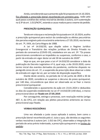 Rev. Trib. Reg. Trab. 3ª Reg., Belo Horizonte, v. 70, n. 110, p. 367-533, jul./dez. 2024527Ainda, considerando que a presente ação foi proposta em 14.10.2024, fica afastada a prescrição bienal reconhecida em primeiro grau, razão pela qual passo a análise das verbas rescisórias devidas à autora, com sustentação no § 3º do art. 1.013/NCPC, estando a causa madura para o exame do pedido.PRESCRIÇÃO QUINQUENALTendo em vista que a reclamação foi ajuizada em 14.10.2024, acolho a prescrição quinquenal para excluir da condenação os efeitos pecuniários das parcelas exigíveis pela via acionária anteriores a 27.05.2019, nos termos do art. 7º, XXIX, da Carta Magna de 1988.A Lei nº 14.010/20, que dispõe sobre o Regime Jurídico Emergencial e Transitório das relações jurídicas de Direito Privado no período do coronavírus (COVID-19), estabelece em seu art. 3º: “Os prazos prescricionais consideram-se impedidos ou suspensos, conforme o caso, a partir da entrada em vigor desta Lei até 30 de outubro de 2020”.Veja-se que, em que pese a Lei nº 14.010/20 considerar a data da publicação do Decreto Legislativo nº 6, qual seja, o dia 20.03.2020, como termo inicial dos eventos derivados da pandemia, conforme disposto no parágrafo único do art. 1º, a suspensão da prescrição deve observar a data de entrada em vigor da Lei, por se tratar de disposição específica.Diante deste cenário, no período de 12 de junho de 2020 a 30 de outubro de 2020, considera-se suspenso o decurso do prazo quinquenal, por 140 dias, circunstância que deve ser observada ao se fixar o marco prescricional quinquenal.Considerando o ajuizamento da ação em 23.01.2024 e deduzidos os dias da suspensão estabelecida na Lei nº 14.010/20 (140 dias), o marco prescricional deve ser fixado em 27.05.2019.Por conseguinte, extingo o processo, com resolução mérito (artigo 487, II, do CPC), em relação aos pleitos pecuniários anteriores ao marco prescricional aqui fixado.VERBAS RESCISÓRIASUma vez afastada a justa causa aplicada à autora, bem como a prescrição bienal reconhecida pelo d. Juízo a quo, são devidas as seguintes verbas rescisórias à autora (art. 1.013 do CPC), observados a integração do período de aviso prévio indenizado, a prescrição quinquenal e os limites do pedido: