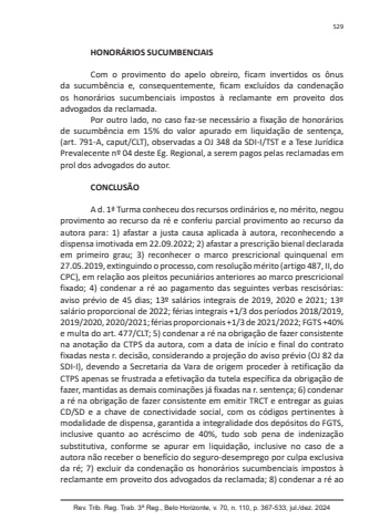 Rev. Trib. Reg. Trab. 3ª Reg., Belo Horizonte, v. 70, n. 110, p. 367-533, jul./dez. 2024529HONORÁRIOS SUCUMBENCIAISCom o provimento do apelo obreiro, ficam invertidos os ônus da sucumbência e, consequentemente, ficam excluídos da condenação os honorários sucumbenciais impostos à reclamante em proveito dos advogados da reclamada.Por outro lado, no caso faz-se necessário a fixação de honorários de sucumbência em 15% do valor apurado em liquidação de sentença, (art. 791-A, caput/CLT), observadas a OJ 348 da SDI-I/TST e a Tese Jurídica Prevalecente nº 04 deste Eg. Regional, a serem pagos pelas reclamadas em prol dos advogados do autor.CONCLUSÃOA d. 1ª Turma conheceu dos recursos ordinários e, no mérito, negou provimento ao recurso da ré e conferiu parcial provimento ao recurso da autora para: 1) afastar a justa causa aplicada à autora, reconhecendo a dispensa imotivada em 22.09.2022; 2) afastar a prescrição bienal declarada em primeiro grau; 3) reconhecer o marco prescricional quinquenal em 27.05.2019, extinguindo o processo, com resolução mérito (artigo 487, II, do CPC), em relação aos pleitos pecuniários anteriores ao marco prescricional fixado; 4) condenar a ré ao pagamento das seguintes verbas rescisórias: aviso prévio de 45 dias; 13º salários integrais de 2019, 2020 e 2021; 13º salário proporcional de 2022; férias integrais +1/3 dos períodos 2018/2019, 2019/2020, 2020/2021; férias proporcionais +1/3 de 2021/2022; FGTS +40% e multa do art. 477/CLT; 5) condenar a ré na obrigação de fazer consistente na anotação da CTPS da autora, com a data de início e final do contrato fixadas nesta r. decisão, considerando a projeção do aviso prévio (OJ 82 da SDI-I), devendo a Secretaria da Vara de origem proceder à retificação da CTPS apenas se frustrada a efetivação da tutela específica da obrigação de fazer, mantidas as demais cominações já fixadas na r. sentença; 6) condenar a ré na obrigação de fazer consistente em emitir TRCT e entregar as guias CD/SD e a chave de conectividade social, com os códigos pertinentes à modalidade de dispensa, garantida a integralidade dos depósitos do FGTS, inclusive quanto ao acréscimo de 40%, tudo sob pena de indenização substitutiva, conforme se apurar em liquidação, inclusive no caso de a autora não receber o benefício do seguro-desemprego por culpa exclusiva da ré; 7) excluir da condenação os honorários sucumbenciais impostos à reclamante em proveito dos advogados da reclamada; 8) condenar a ré ao
