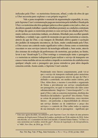 53Rev. Trib. Reg. Trab. 3ª Reg., Belo Horizonte, v. 70, n. 110, p. 37-62, jul./dez. 2024indicadas pela Uber - os motoristas fornecem, afinal, a mão-de-obra de que a Uber necessita para explorar o seu próprio negócio.8Vale a pena recapitular o essencial da argumentação expendida, in casu, pelo SupremeCourt: a remuneração paga aos motoristas pelo trabalho é fixada pela Uber e os motoristas não têm qualquer palavra a dizer quanto a isto (salvo, claro, ao decidirem quando trabalhar e quanto trabalham prestam); as condições contratuais ao abrigo das quais os motoristas prestam os seus serviços são ditadas pela Uber; muito embora os motoristas tenham, em abstrato, liberdade para escolher quando trabalham, a verdade é que, a partir do momento em que um motorista se conecte, através da app da Uber, a sua margem de liberdade efetiva quanto à aceitação dos pedidos de transporte encontra-se, de facto, muito condicionada pela Uber; a Uber exerce um controlo muito significativo sobre a forma como os motoristas executam os seus serviços (através da tecnologia utilizada e, bem assim, através dos sistemas de avaliação da performance do motorista, que podem, no limite, levar à sua “desativação”); a Uber restringe a comunicação entre o passageiro e o motorista ao mínimo indispensável para realizar o serviço de transporte em causa e toma medidas ativas em ordem a impedir os motoristas de estabelecerem qualquer relação com o passageiro que possa estender-se para além daquela concreta corrida. Assim sendo, o Supreme Court conclui:Ponderando estes fatores conjuntamente, pode ver-se que o serviço de transporte realizado pelos motoristas e oferecido aos passageiros através da app da Uber é definido e controlado, em moldes muito estritos, pela Uber. Além disso, o mesmo é concebido e organizado de forma a providenciar um serviço estandardizado aos passageiros, no qual os motoristas são tidos como substancialmente fungíveis (“interchangeable”) e do qual a Uber, e não os concretos motoristas, desfruta dos benefícios da lealdade e “goodwill” dos clientes. Vistas as coisas da perspetiva dos motoristas, esses mesmos fatores - em particular, a impossibilidade de oferecer um serviço distinto ou de estabelecer o preço dos serviços e o controlo da Uber sobre todos os aspetos da sua interação com os passageiros - significam que 8 Este caso agora decidido, em defi nitivo, pelo Supreme Court, foi objeto de uma primeira sentença do Employment Tribunal de Londres, proferida em 28 de outubro de 2016. Sobre esta decisão, vd. o comentário de João Leal Amado e Catarina Gomes Santos, “A Uber e os seus motoristas em Londres: mind the gap!”, Revista de Legislação e de Jurisprudência, n.º 4001, Nov.-Dez. de 2016, pp. 111-127.