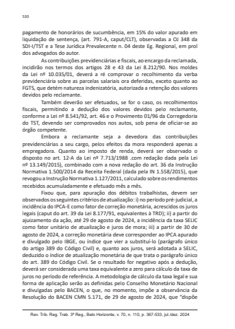 Rev. Trib. Reg. Trab. 3ª Reg., Belo Horizonte, v. 70, n. 110, p. 367-533, jul./dez. 2024530pagamento de honorários de sucumbência, em 15% do valor apurado em liquidação de sentença, (art. 791-A, caput/CLT), observadas a OJ 348 da SDI-I/TST e a Tese Jurídica Prevalecente n. 04 deste Eg. Regional, em prol dos advogados do autor.As contribuições previdenciárias e fiscais, ao encargo da reclamada, incidirão nos termos dos artigos 28 e 43 da Lei 8.212/90. Nos moldes da Lei nº 10.035/01, deverá a ré comprovar o recolhimento da verba previdenciária sobre as parcelas salariais ora deferidas, exceto quanto ao FGTS, que detém natureza indenizatória, autorizada a retenção dos valores devidos pelo reclamante.Também deverão ser efetuados, se for o caso, os recolhimentos fiscais, permitindo a dedução dos valores devidos pelo reclamante, conforme a Lei nº 8.541/92, art. 46 e o Provimento 01/96 da Corregedoria do TST, devendo ser comprovados nos autos, sob pena de oficiar-se ao órgão competente.Embora a reclamante seja a devedora das contribuições previdenciárias a seu cargo, pelos efeitos da mora responderá apenas a empregadora. Quanto ao imposto de renda, deverá ser observado o disposto no art. 12-A da Lei nº 7.713/1988 .com redação dada pela Lei nº 13.149/2015), combinado com a nova redação do art. 36 da Instrução Normativa 1.500/2014 da Receita Federal (dada pela IN 1.558/2015), que revogou a Instrução Normativa 1.127/2011, calculado sobre os rendimentos recebidos acumuladamente e efetuado mês a mês.Fixou que, para apuração dos débitos trabalhistas, devem ser observados os seguintes critérios de atualização: i) no período pré-judicial, a incidência do IPCA-E como fator de correção monetária, acrescidos os juros legais (caput do art. 39 da Lei 8.177/91, equivalentes à TRD); ii) a partir do ajuizamento da ação, até 29 de agosto de 2024, a incidência da taxa SELIC como fator unitário de atualização e juros de mora; iii) a partir de 30 de agosto de 2024, a correção monetária deve corresponder ao IPCA apurado e divulgado pelo IBGE, ou índice que vier a substituí-lo (parágrafo único do artigo 389 do Código Civil) e, quanto aos juros, será adotada a SELIC, deduzido o índice de atualização monetária de que trata o parágrafo único do art. 389 do Código Civil. Se o resultado for negativo após a dedução, deverá ser considerada uma taxa equivalente a zero para cálculo da taxa de juros no período de referência. A metodologia de cálculo da taxa legal e sua forma de aplicação serão as definidas pelo Conselho Monetário Nacional e divulgadas pelo BACEN, o que, no momento, impõe a observância da Resolução do BACEN CMN 5.171, de 29 de agosto de 2024, que “dispõe