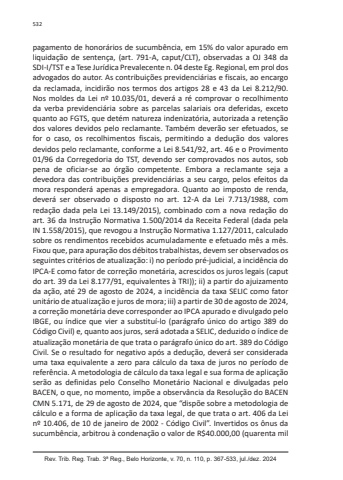 Rev. Trib. Reg. Trab. 3ª Reg., Belo Horizonte, v. 70, n. 110, p. 367-533, jul./dez. 2024532pagamento de honorários de sucumbência, em 15% do valor apurado em liquidação de sentença, (art. 791-A, caput/CLT), observadas a OJ 348 da SDI-I/TST e a Tese Jurídica Prevalecente n. 04 deste Eg. Regional, em prol dos advogados do autor. As contribuições previdenciárias e fiscais, ao encargo da reclamada, incidirão nos termos dos artigos 28 e 43 da Lei 8.212/90. Nos moldes da Lei nº 10.035/01, deverá a ré comprovar o recolhimento da verba previdenciária sobre as parcelas salariais ora deferidas, exceto quanto ao FGTS, que detém natureza indenizatória, autorizada a retenção dos valores devidos pelo reclamante. Também deverão ser efetuados, se for o caso, os recolhimentos fiscais, permitindo a dedução dos valores devidos pelo reclamante, conforme a Lei 8.541/92, art. 46 e o Provimento 01/96 da Corregedoria do TST, devendo ser comprovados nos autos, sob pena de oficiar-se ao órgão competente. Embora a reclamante seja a devedora das contribuições previdenciárias a seu cargo, pelos efeitos da mora responderá apenas a empregadora. Quanto ao imposto de renda, deverá ser observado o disposto no art. 12-A da Lei 7.713/1988, com redação dada pela Lei 13.149/2015), combinado com a nova redação do art. 36 da Instrução Normativa 1.500/2014 da Receita Federal (dada pela IN 1.558/2015), que revogou a Instrução Normativa 1.127/2011, calculado sobre os rendimentos recebidos acumuladamente e efetuado mês a mês. Fixou que, para apuração dos débitos trabalhistas, devem ser observados os seguintes critérios de atualização: i) no período pré-judicial, a incidência do IPCA-E como fator de correção monetária, acrescidos os juros legais (caput do art. 39 da Lei 8.177/91, equivalentes à TRI)); ii) a partir do ajuizamento da ação, até 29 de agosto de 2024, a incidência da taxa SELIC como fator unitário de atualização e juros de mora; iii) a partir de 30 de agosto de 2024, a correção monetária deve corresponder ao IPCA apurado e divulgado pelo IBGE, ou índice que vier a substituí-lo (parágrafo único do artigo 389 do Código Civil) e, quanto aos juros, será adotada a SELIC, deduzido o índice de atualização monetária de que trata o parágrafo único do art. 389 do Código Civil. Se o resultado for negativo após a dedução, deverá ser considerada uma taxa equivalente a zero para cálculo da taxa de juros no período de referência. A metodologia de cálculo da taxa legal e sua forma de aplicação serão as definidas pelo Conselho Monetário Nacional e divulgadas pelo BACEN, o que, no momento, impõe a observância da Resolução do BACEN CMN 5.171, de 29 de agosto de 2024, que “dispõe sobre a metodologia de cálculo e a forma de aplicação da taxa legal, de que trata o art. 406 da Lei nº 10.406, de 10 de janeiro de 2002 - Código Civil”. Invertidos os ônus da sucumbência, arbitrou à condenação o valor de R$40.000,00 (quarenta mil
