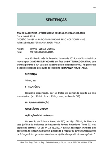 Rev. Trib. Reg. Trab. 3ª Reg., Belo Horizonte, v. 70, n. 110, p. 535-734, jul./dez. 2024535SENTENÇASATA DE AUDIÊNCIA - PROCESSO Nº 0011162-85.2024.5.03.0181Data: 10.02.2025DECISÃO DA 43ª VARA DO TRABALHO DE BELO HORIZONTE - MGJuíza Substituta: FERNANDA NIGRI FARIAAutor: DAVID FLESLEY GOMESRéu: 99 TECNOLOGIA LTDAAos 10 dias do mês de fevereiro do ano de 2025, na ação trabalhista movida por DAVID FLESLEY GOMES em face de 99 TECNOLOGIA LTDA, que tramita perante a 43ª Vara do Trabalho de Belo Horizonte/MG, foi proferida a seguinte decisão pela Juíza do Trabalho FERNANDA NIGRI FARIA.SENTENÇAVistos, etc.I - RELATÓRIORelatório dispensado, por se tratar de demanda sujeita ao rito sumaríssimo (art. 852-A c/c art. 852-I, caput, ambos da CLT).II - FUNDAMENTAÇÃOQUESTÃO DE ORDEMAplicação da lei no tempoNa sessão do Tribunal Pleno do TST, de 25/11/2024, foi fixada a tese jurídica do Incidente de Recurso de Revista Repetitivo (Tema 23) nos seguintes termos: “A Lei nº 13.467/2017 possui aplicação imediata aos contratos de trabalho em curso, passando a regular os direitos decorrentes de lei cujos fatos geradores tenham se efetivado a partir de sua vigência.”