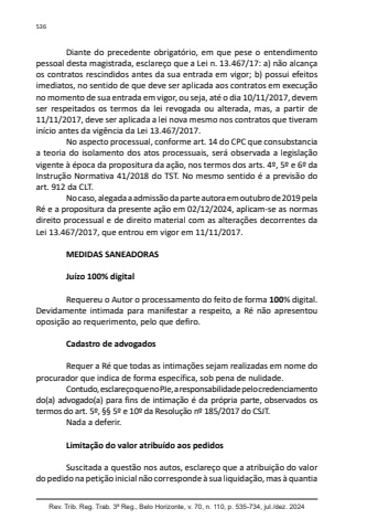Rev. Trib. Reg. Trab. 3ª Reg., Belo Horizonte, v. 70, n. 110, p. 535-734, jul./dez. 2024536Diante do precedente obrigatório, em que pese o entendimento pessoal desta magistrada, esclareço que a Lei n. 13.467/17: a) não alcança os contratos rescindidos antes da sua entrada em vigor; b) possui efeitos imediatos, no sentido de que deve ser aplicada aos contratos em execução no momento de sua entrada em vigor, ou seja, até o dia 10/11/2017, devem ser respeitados os termos da lei revogada ou alterada, mas, a partir de 11/11/2017, deve ser aplicada a lei nova mesmo nos contratos que tiveram início antes da vigência da Lei 13.467/2017.No aspecto processual, conforme art. 14 do CPC que consubstancia a teoria do isolamento dos atos processuais, será observada a legislação vigente à época da propositura da ação, nos termos dos arts. 4º, 5º e 6º da Instrução Normativa 41/2018 do TST. No mesmo sentido é a previsão do art. 912 da CLT.No caso, alegada a admissão da parte autora em outubro de 2019 pela Ré e a propositura da presente ação em 02/12/2024, aplicam-se as normas direito processual e de direito material com as alterações decorrentes da Lei 13.467/2017, que entrou em vigor em 11/11/2017.MEDIDAS SANEADORASJuízo 100% digitalRequereu o Autor o processamento do feito de forma 100% digital. Devidamente intimada para manifestar a respeito, a Ré não apresentou oposição ao requerimento, pelo que defiro.Cadastro de advogadosRequer a Ré que todas as intimações sejam realizadas em nome do procurador que indica de forma específica, sob pena de nulidade.Contudo, esclareço que no PJe, a responsabilidade pelo credenciamento do(a) advogado(a) para fins de intimação é da própria parte, observados os termos do art. 5º, §§ 5º e 10º da Resolução nº 185/2017 do CSJT.Nada a deferir.Limitação do valor atribuído aos pedidosSuscitada a questão nos autos, esclareço que a atribuição do valor do pedido na petição inicial não corresponde à sua liquidação, mas à quantia