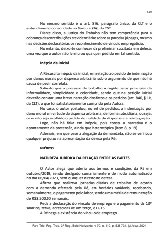 Rev. Trib. Reg. Trab. 3ª Reg., Belo Horizonte, v. 70, n. 110, p. 535-734, jul./dez. 2024539No mesmo sentido é o art. 876, parágrafo único, da CLT e o entendimento consolidado na Súmula 368, do TST.Diante disso, a Justiça do Trabalho não tem competência para a cobrança das contribuições previdenciárias sobre as parcelas já pagas, mesmo nas decisões declaratórias de reconhecimento de vínculo empregatício.No entanto, deixo de conhecer da preliminar suscitada em defesa, uma vez que o autor não formulou qualquer pedido em tal sentido.Inépcia da inicialA Ré suscita inépcia da inicial, em relação ao pedido de indenização por danos morais por dispensa arbitrária, sob o argumento de que não há causa de pedir correlata.Saliento que o processo do trabalho é regido pelos princípios da informalidade, simplicidade e celeridade, sendo que na petição inicial deverão constar uma breve narração dos fatos e os pedidos (art. 840, § 1º, da CLT), o que foi satisfatoriamente cumprido pela Autora.No caso, o autor postulou, no rol de pedidos, a indenização por dano moral em virtude da dispensa arbitrária, de forma subsidiária, ou seja, caso não seja acolhido o pedido de nulidade da dispensa e a reintegração.Logo, não há falar em inépcia, pois consta a narrativa e o apontamento da pretensão, ainda que heterotópica (item 8, p.19).Ademais, em que pese a alegação da demandada, não se verificou qualquer prejuízo na apresentação da defesa pela Ré.MÉRITONATUREZA JURÍDICA DA RELAÇÃO ENTRE AS PARTESO Autor alega que aderiu aos termos e condições da Ré em outubro/2019, sendo desligado sumariamente e de modo automatizado no dia 06/04/2023, sem qualquer direito de defesa.Afirma que realizava jornadas diárias de trabalho de acordo com a demanda ofertada pela Ré, em horários variáveis, recebendo, semanalmente, o pagamento pelo labor, sendo uma média de remuneração de R$3.500,00 semanais.Pede a declaração do vínculo de emprego e o pagamento de 13º salários, férias, acrescidas de um terço, e FGTS.A Ré nega a existência do vínculo de emprego.