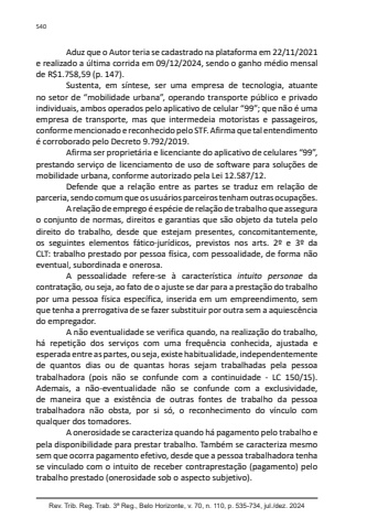 Rev. Trib. Reg. Trab. 3ª Reg., Belo Horizonte, v. 70, n. 110, p. 535-734, jul./dez. 2024540Aduz que o Autor teria se cadastrado na plataforma em 22/11/2021 e realizado a última corrida em 09/12/2024, sendo o ganho médio mensal de R$1.758,59 (p. 147).Sustenta, em síntese, ser uma empresa de tecnologia, atuante no setor de “mobilidade urbana”, operando transporte público e privado individuais, ambos operados pelo aplicativo de celular “99”; que não é uma empresa de transporte, mas que intermedeia motoristas e passageiros, conforme mencionado e reconhecido pelo STF. Afirma que tal entendimento é corroborado pelo Decreto 9.792/2019.Afirma ser proprietária e licenciante do aplicativo de celulares “99”, prestando serviço de licenciamento de uso de software para soluções de mobilidade urbana, conforme autorizado pela Lei 12.587/12.Defende que a relação entre as partes se traduz em relação de parceria, sendo comum que os usuários parceiros tenham outras ocupações.A relação de emprego é espécie de relação de trabalho que assegura o conjunto de normas, direitos e garantias que são objeto da tutela pelo direito do trabalho, desde que estejam presentes, concomitantemente, os seguintes elementos fático-jurídicos, previstos nos arts. 2º e 3º da CLT: trabalho prestado por pessoa física, com pessoalidade, de forma não eventual, subordinada e onerosa.A pessoalidade refere-se à característica intuito personae da contratação, ou seja, ao fato de o ajuste se dar para a prestação do trabalho por uma pessoa física específica, inserida em um empreendimento, sem que tenha a prerrogativa de se fazer substituir por outra sem a aquiescência do empregador.A não eventualidade se verifica quando, na realização do trabalho, há repetição dos serviços com uma frequência conhecida, ajustada e esperada entre as partes, ou seja, existe habitualidade, independentemente de quantos dias ou de quantas horas sejam trabalhadas pela pessoa trabalhadora (pois não se confunde com a continuidade - LC 150/15). Ademais, a não-eventualidade não se confunde com a exclusividade, de maneira que a existência de outras fontes de trabalho da pessoa trabalhadora não obsta, por si só, o reconhecimento do vínculo com qualquer dos tomadores.A onerosidade se caracteriza quando há pagamento pelo trabalho e pela disponibilidade para prestar trabalho. Também se caracteriza mesmo sem que ocorra pagamento efetivo, desde que a pessoa trabalhadora tenha se vinculado com o intuito de receber contraprestação (pagamento) pelo trabalho prestado (onerosidade sob o aspecto subjetivo).