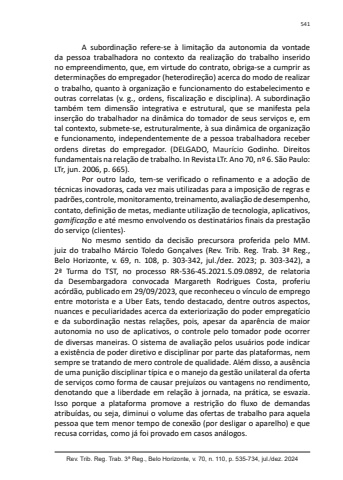 Rev. Trib. Reg. Trab. 3ª Reg., Belo Horizonte, v. 70, n. 110, p. 535-734, jul./dez. 2024541A subordinação refere-se à limitação da autonomia da vontade da pessoa trabalhadora no contexto da realização do trabalho inserido no empreendimento, que, em virtude do contrato, obriga-se a cumprir as determinações do empregador (heterodireção) acerca do modo de realizar o trabalho, quanto à organização e funcionamento do estabelecimento e outras correlatas (v. g., ordens, fiscalização e disciplina). A subordinação também tem dimensão integrativa e estrutural, que se manifesta pela inserção do trabalhador na dinâmica do tomador de seus serviços e, em tal contexto, submete-se, estruturalmente, à sua dinâmica de organização e funcionamento, independentemente de a pessoa trabalhadora receber ordens diretas do empregador. (DELGADO, Maurício Godinho. Direitos fundamentais na relação de trabalho. In Revista LTr. Ano 70, nº 6. São Paulo: LTr, jun. 2006, p. 665).Por outro lado, tem-se verificado o refinamento e a adoção de técnicas inovadoras, cada vez mais utilizadas para a imposição de regras e padrões, controle, monitoramento, treinamento, avaliação de desempenho, contato, definição de metas, mediante utilização de tecnologia, aplicativos, gamificação e até mesmo envolvendo os destinatários finais da prestação do serviço (clientes).No mesmo sentido da decisão precursora proferida pelo MM. juiz do trabalho Márcio Toledo Gonçalves (Rev. Trib. Reg. Trab. 3ª Reg., Belo Horizonte, v. 69, n. 108, p. 303-342, jul./dez. 2023; p. 303-342), a 2ª Turma do TST, no processo RR-536-45.2021.5.09.0892, de relatoria da Desembargadora convocada Margareth Rodrigues Costa, proferiu acórdão, publicado em 29/09/2023, que reconheceu o vínculo de emprego entre motorista e a Uber Eats, tendo destacado, dentre outros aspectos, nuances e peculiaridades acerca da exteriorização do poder empregatício e da subordinação nestas relações, pois, apesar da aparência de maior autonomia no uso de aplicativos, o controle pelo tomador pode ocorrer de diversas maneiras. O sistema de avaliação pelos usuários pode indicar a existência de poder diretivo e disciplinar por parte das plataformas, nem sempre se tratando de mero controle de qualidade. Além disso, a ausência de uma punição disciplinar típica e o manejo da gestão unilateral da oferta de serviços como forma de causar prejuízos ou vantagens no rendimento, denotando que a liberdade em relação à jornada, na prática, se esvazia. Isso porque a plataforma promove a restrição do fluxo de demandas atribuídas, ou seja, diminui o volume das ofertas de trabalho para aquela pessoa que tem menor tempo de conexão (por desligar o aparelho) e que recusa corridas, como já foi provado em casos análogos.