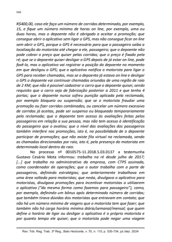 Rev. Trib. Reg. Trab. 3ª Reg., Belo Horizonte, v. 70, n. 110, p. 535-734, jul./dez. 2024546R$400,00, caso ele faça um número de corridas determinado, por exemplo, 15, e fique um número mínimo de horas on line, por exemplo, uma ou duas horas, mas o depoente não é obrigado a aceitar a promoção; que consegue abrir o aplicativo sem ligar o GPS, mas não consegue ficar on line sem abrir o GPS, porque o GPS é necessário para que o passageiro saiba a localização do motorista até chegar a ele, passageiro; que o depoente não pode cobrar o preço que quiser pelas corridas; que o preço é fixado pela ré; que se o depoente quiser desligar o GPS depois de já estar on line, pode fazê-lo, mas o aplicativo vai registrar a posição do depoente no momento em que desligou o GPS; que o aplicativo notifica o motorista para ligar o GPS para receber chamadas, mas se o depoente já estava on line e desligar o GPS o depoente vai continuar chamadas oriundas de uma região de raio de 2 KM; que não é possível cadastrar o carro que o depoente quiser, sendo requisito que o carro seja de fabricação posterior a 2011 e que tenha 4 portas; que o depoente nunca sofreu punição aplicada pela reclamada, por exemplo bloqueio ou suspensão; que se o motorista fraudar uma promoção ou fizer corridas combinadas, ou cancelar um número excessivo de corridas já aceitas, pode ser suspenso ou bloqueado temporariamente pela reclamada; que o depoente tem acesso às avaliações feitas pelos passageiros em relação a sua pessoa, mas não tem acesso à identificação do passageiro que o avaliou; que o nível das avaliações dos passageiros também interfere nas promoções, isto é, na possibilidade de o depoente participar de promoções; que não existe fila virtual na reclamada, sendo as chamadas direcionadas por raio, isto é, pela presença do motorista em determinado local dentro do raio.No processo nº 0010575-11.2018.5.03.0137 a testemunha Gustavo Cesário Mota informou: trabalha na ré desde julho de 2017; [...] que trabalha no administrativo da empresa, com CTPS assinada, como coordenador de operações; que o autor trabalha com a parte de passageiros, definindo estratégias; que anteriormente trabalhava em uma área voltada para motoristas; que nesta, divulgava o aplicativo para motoristas, divulgava promoções para incentivar motoristas a utilizarem o aplicativo (“da mesma forma como fazemos para passageiro”), como, por exemplo, definindo um bônus após determinado número de corridas; que também tirava dúvidas dos motoristas que entravam em contato; que não há um número mínimo de viagens que o motorista tem que fazer; que também não há carga horária mínima diária/semanal/mensal; que quem define o horário de ligar ou desligar o aplicativo é o próprio motorista e por quanto tempo ele quiser; que o motorista pode negar uma viagem