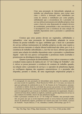 55Rev. Trib. Reg. Trab. 3ª Reg., Belo Horizonte, v. 70, n. 110, p. 37-62, jul./dez. 2024Criar uma presunção de laboralidade adaptada ao trabalho nas plataformas digitais, para tornar mais clara e efetiva a distinção entre trabalhador por conta de outrem e trabalhador por conta própria, sublinhando que a circunstância de o prestador de serviço utilizar instrumentos de trabalho próprios, bem como o facto de estar dispensado de cumprir deveres de assiduidade, pontualidade e não concorrência, não é incompatível com a existência de uma relação de trabalho dependente entre o prestador e a plataforma digital.10Cremos que estes pontos devem ser registados, sublinhados e aplaudidos: criar uma presunção de laboralidade, adaptada às novas formas de prestar trabalho via apps; sublinhar que o facto de o prestador de serviço utilizar instrumentos de trabalho próprios ou não estar sujeito a certos deveres inerentes à relação laboral tradicional não obsta, por si só, à existência de trabalho subordinado; e, last but not least, afirmar que poderá existir uma relação de trabalho dependente entre o prestador e a plataforma digital - tudo isto nos parece corresponder a premissas muito acertadas e promissoras na abordagem destas questões.Quanto à presunção de laboralidade a criar, talvez a mesma se venha a traduzir numa espécie de réplica do art. 12.º do Código do Trabalho11, isto é, talvez se possa presumir a existência de contrato de trabalho quando, na relação entre o prestador de serviço e o operador de plataforma digital, se verifiquem algumas das seguintes características: i) o prestador não disponha, perante o cliente, de uma organização empresarial própria e 10 A consagração de uma presunção de laboralidade neste domínio foi também acolhida por uma recente lei espanhola, o Real Decreto-lei 9/2021, de 11 de maio, nos termos do qual, por aplicação do estabelecido no art. 8.1 do Estatuto de los Trabajadores, presumese incluída no âmbito desta lei a atividade das pessoas que prestem serviços retribuídos consistentes na entrega ou distribuição de qualquer produto de consumo ou mercadoria, por parte de empregadores que exerçam as faculdades empresariais de organização, direção e controlo de forma direta, indireta ou implícita, mediante a gestão algorítmica do serviço ou das condições de trabalho, através de uma plataforma digital. 11 Sobre a presunção constante do art. 12.º do Código do Trabalho, uma presunção muito útil, em geral, mas que se revela impotente perante as novas formas de prestar trabalho através de plataformas digitais, permitimo-nos remeter para João Leal Amado, Contratode Trabalho - Noções Básicas, 3.ª ed., Almedina, Coimbra, 2020 (reimp.), pp. 65-71.
