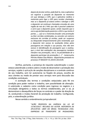 Rev. Trib. Reg. Trab. 3ª Reg., Belo Horizonte, v. 70, n. 110, p. 535-734, jul./dez. 2024552depois de já estar online, pode fazê-lo, mas o aplicativo vai registrar a posição do depoente no momento em que desligou o GPS; que o aplicativo notifica o motorista para ligar o GPS para receber chamadas, mas se o depoente já estava online e desligar o GPS o depoente vai continuar chamadas oriundas de uma região de raio de 2 KM; que não é possível cadastrar o carro que o depoente quiser, sendo requisito que o carro seja de fabricação posterior a 2011 e que tenha 4 portas...;...que se o motorista fraudar uma promoção ou fizer corridas combinadas, ou cancelar um número excessivo de corridas já aceitas, pode ser suspenso ou bloqueado temporariamente pela reclamada; que o depoente tem acesso às avaliações feitas pelos passageiros em relação a sua pessoa, mas não tem acesso à identificação do passageiro que o avaliou; que o nível das avaliações dos passageiros também interfere nas promoções, isto é, na possibilidade de o depoente participar de promoções (...)” - testemunha Péricles Abalen Dias Ribeiro - depoimento prestado no processo nº 0010247-41.2019.5.03.0139.Verifico, portanto, a presença do requisito subordinação: o autor estava subordinado a ordens sobre o modo de desenvolver a prestação dos serviços, sujeito à aplicação de sanções disciplinares e a controle contínuo do seu trabalho, sem ter autonomia na fixação de preços, escolha de seus clientes ou modo de prestar seus serviços nem para discussão das condições contratuais.A aceitação dos termos e condições estipulados pela Ré era condição para poder realizar o trabalho, sem possibilidade de alteração. A submissão a cadastro como condição para ingresso no negócio e a vinculação obrigatória a todos os termos estabelecidos, por si só, já demonstram o desequilíbrio de forças no contrato e o poder de direção da ré, conduzindo o modus faciendi da prestação de trabalho. Configurada, pois, a subordinação jurídica.Nesse sentido o entendimento jurisprudencial:“AÇÃO PROPOSTA NA VIGÊNCIA DA LEI Nº 13.467/2017. RECURSO DO AUTOR. MOTORISTA DE APLICATIVO. UBER DO BRASIL TECNOLOGIA LTDA. EMPRESAS DE TRANSPORTE DE PASSAGEIROS.