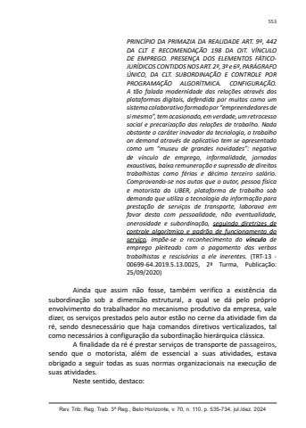 Rev. Trib. Reg. Trab. 3ª Reg., Belo Horizonte, v. 70, n. 110, p. 535-734, jul./dez. 2024553PRINCÍPIO DA PRIMAZIA DA REALIDADE ART. 9º, 442 DA CLT E RECOMENDAÇÃO 198 DA OIT. VÍNCULO DE EMPREGO. PRESENÇA DOS ELEMENTOS FÁTICOJURÍDICOS CONTIDOS NOS ART. 2º, 3º e 6º, PARÁGRAFO ÚNICO, DA CLT. SUBORDINAÇÃO E CONTROLE POR PROGRAMAÇÃO ALGORÍTMICA. CONFIGURAÇÃO. A tão falada modernidade das relações através das plataformas digitais, defendida por muitos como um sistema colaborativo formado por “empreendedores de si mesmo”, tem ocasionado, em verdade, um retrocesso social e precarização das relações de trabalho. Nada obstante o caráter inovador da tecnologia, o trabalho on demand através de aplicativo tem se apresentado como um “museu de grandes novidades”: negativa de vínculo de emprego, informalidade, jornadas exaustivas, baixa remuneração e supressão de direitos trabalhistas como férias e décimo terceiro salário. Comprovando-se nos autos que o autor, pessoa física e motorista da UBER, plataforma de trabalho sob demanda que utiliza a tecnologia da informação para prestação de serviços de transporte, laborava em favor desta com pessoalidade, não eventualidade, onerosidade e subordinação, seguindo diretrizes de controle algorítmico e padrão de funcionamento do serviço, impõe-se o reconhecimento do vínculo de emprego pleiteado com o pagamento das verbas trabalhistas e rescisórias a ele inerentes. (TRT-13 - 00699-64.2019.5.13.0025, 2ª Turma, Publicação: 25/09/2020)Ainda que assim não fosse, também verifico a existência da subordinação sob a dimensão estrutural, a qual se dá pelo próprio envolvimento do trabalhador no mecanismo produtivo da empresa, vale dizer, os serviços prestados pelo autor estão no cerne da atividade fim da ré, sendo desnecessário que haja comandos diretivos verticalizados, tal como necessários à configuração da subordinação hierárquica clássica.A finalidade da ré é prestar serviços de transporte de passageiros, sendo que o motorista, além de essencial a suas atividades, estava obrigado a seguir todas as suas normas organizacionais na execução de suas atividades.Neste sentido, destaco: