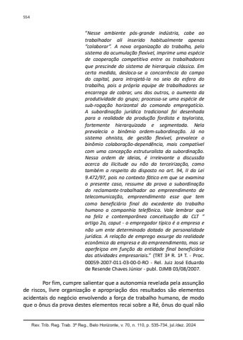 Rev. Trib. Reg. Trab. 3ª Reg., Belo Horizonte, v. 70, n. 110, p. 535-734, jul./dez. 2024554“Nesse ambiente pós-grande indústria, cabe ao trabalhador ali inserido habitualmente apenas “colaborar”. A nova organização do trabalho, pelo sistema da acumulação flexível, imprime uma espécie de cooperação competitiva entre os trabalhadores que prescinde do sistema de hierarquia clássica. Em certa medida, desloca-se a concorrência do campo do capital, para introjetá-la no seio da esfera do trabalho, pois a própria equipe de trabalhadores se encarrega de cobrar, uns dos outros, o aumento da produtividade do grupo; processa-se uma espécie de sub-rogação horizontal do comando empregatício. A subordinação jurídica tradicional foi desenhada para a realidade da produção fordista e taylorista, fortemente hierarquizada e segmentada. Nela prevalecia o binômio ordem-subordinação. Já no sistema ohnista, de gestão flexível, prevalece o binômio colaboração-dependência, mais compatível com uma concepção estruturalista da subordinação. Nessa ordem de ideias, é irrelevante a discussão acerca da ilicitude ou não da terceirização, como também a respeito do disposto no art. 94, II da Lei 9.472/97, pois no contexto fático em que se examina o presente caso, ressume da prova a subordinação do reclamante-trabalhador ao empreendimento de telecomunicação, empreendimento esse que tem como beneficiário final do excedente do trabalho humano a companhia telefônica. Vale lembrar que na feliz e contemporânea conceituação da CLT “ artigo 2o, caput - o empregador típico é a empresa e não um ente determinado dotado de personalidade jurídica. A relação de emprego exsurge da realidade econômica da empresa e do empreendimento, mas se aperfeiçoa em função da entidade final beneficiária das atividades empresariais.” (TRT 3ª R. 1ª T. - Proc. 00059-2007-011-03-00-0-RO - Rel. Juiz José Eduardo de Resende Chaves Júnior - publ. DJMB 03/08/2007.Por fim, cumpre salientar que a autonomia revelada pela assunção de riscos, livre organização e apropriação dos resultados são elementos acidentais do negócio envolvendo a força de trabalho humano, de modo que o ônus da prova destes elementos recai sobre a Ré, ônus do qual não