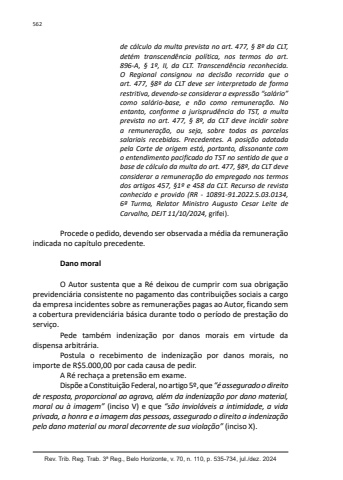 Rev. Trib. Reg. Trab. 3ª Reg., Belo Horizonte, v. 70, n. 110, p. 535-734, jul./dez. 2024562de cálculo da multa prevista no art. 477, § 8º da CLT, detém transcendência política, nos termos do art. 896-A, § 1º, II, da CLT. Transcendência reconhecida. O Regional consignou na decisão recorrida que o art. 477, §8º da CLT deve ser interpretado de forma restritiva, devendo-se considerar a expressão “salário” como salário-base, e não como remuneração. No entanto, conforme a jurisprudência do TST, a multa prevista no art. 477, § 8º, da CLT deve incidir sobre a remuneração, ou seja, sobre todas as parcelas salariais recebidas. Precedentes. A posição adotada pela Corte de origem está, portanto, dissonante com o entendimento pacificado do TST no sentido de que a base de cálculo da multa do art. 477, §8º, da CLT deve considerar a remuneração do empregado nos termos dos artigos 457, §1º e 458 da CLT. Recurso de revista conhecido e provido (RR - 10891-91.2022.5.03.0134, 6ª Turma, Relator Ministro Augusto Cesar Leite de Carvalho, DEJT 11/10/2024, grifei).Procede o pedido, devendo ser observada a média da remuneração indicada no capítulo precedente.Dano moralO Autor sustenta que a Ré deixou de cumprir com sua obrigação previdenciária consistente no pagamento das contribuições sociais a cargo da empresa incidentes sobre as remunerações pagas ao Autor, ficando sem a cobertura previdenciária básica durante todo o período de prestação do serviço.Pede também indenização por danos morais em virtude da dispensa arbitrária.Postula o recebimento de indenização por danos morais, no importe de R$5.000,00 por cada causa de pedir.A Ré rechaça a pretensão em exame.Dispõe a Constituição Federal, no artigo 5º, que “é assegurado o direito de resposta, proporcional ao agravo, além da indenização por dano material, moral ou à imagem” (inciso V) e que “são invioláveis a intimidade, a vida privada, a honra e a imagem das pessoas, assegurado o direito a indenização pelo dano material ou moral decorrente de sua violação” (inciso X).