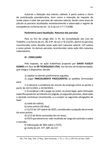 Rev. Trib. Reg. Trab. 3ª Reg., Belo Horizonte, v. 70, n. 110, p. 535-734, jul./dez. 2024567Autorizo a dedução dos valores cabíveis à parte autora a título de contribuição previdenciária, bem como a retenção do imposto de renda sobre o total das parcelas de natureza salarial, tendo como base de cálculo as parcelas atualizadas monetariamente e observado o regime de competência na forma do art. 12-A da Lei n.º 7.713/88.Parâmetros para liquidação. Natureza das parcelasPara os fins do artigo 832, § 3º, da Consolidação das Leis do Trabalho, e na forma do art. 28, § 9º, da Lei n.º 8.212/91, dentre as parcelas reconhecidas como devidas nesta ação tem natureza salarial: 13º salário e aviso prévio. As demais parcelas reconhecidas nesta ação têm natureza indenizatória.III - CONCLUSÃOPelo exposto, na ação trabalhista proposta por DAVID FLESLEY GOMES em face de 99 TECNOLOGIA LTDA, nos termos da fundamentação, que integra o dispositivo, decido:1) rejeitar as demais preliminares arguidas;2) julgar PARCIALMENTE PROCEDENTES os pedidos formulados para:2.1) declarar a existência do vínculo de emprego entre as partes a partir de 22/11/2021 a 24/10/2023;2.2) condenar a Ré a pagar ao Autor, no prazo legal, após intimação específica posterior ao trânsito em julgado, as seguintes parcelas, observado o período contratual reconhecido, e a cumprir as seguintes obrigações de fazer:a) saldo de salário;b) aviso prévio (30 dias);c) 11/12 do 13º salário de 2023, considerada a projeção decorrente do aviso prévio;d) 2/12 de férias acrescidas de um terço;e) FGTS que deveria ter sido recolhido ao longo do contrato e sobre a rescisão;f) indenização de 40% sobre o FGTS;g) multa do art. 477, §8º, da CLT.