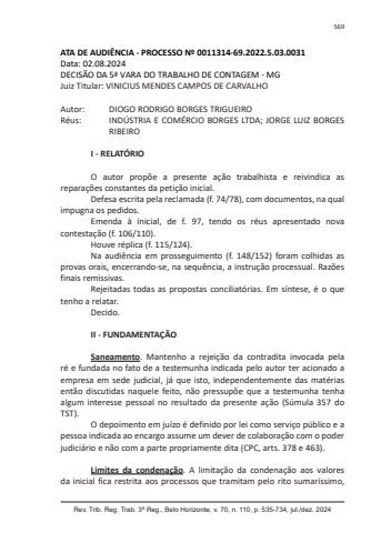 Rev. Trib. Reg. Trab. 3ª Reg., Belo Horizonte, v. 70, n. 110, p. 535-734, jul./dez. 2024569ATA DE AUDIÊNCIA - PROCESSO Nº 0011314-69.2022.5.03.0031Data: 02.08.2024DECISÃO DA 5ª VARA DO TRABALHO DE CONTAGEM - MGJuiz Titular: VINICIUS MENDES CAMPOS DE CARVALHOAutor: DIOGO RODRIGO BORGES TRIGUEIRORéus: INDÚSTRIA E COMÉRCIO BORGES LTDA; JORGE LUIZ BORGES RIBEIROI - RELATÓRIOO autor propõe a presente ação trabalhista e reivindica as reparações constantes da petição inicial.Defesa escrita pela reclamada (f. 74/78), com documentos, na qual impugna os pedidos.Emenda à inicial, de f. 97, tendo os réus apresentado nova contestação (f. 106/110).Houve réplica (f. 115/124).Na audiência em prosseguimento (f. 148/152) foram colhidas as provas orais, encerrando-se, na sequência, a instrução processual. Razões finais remissivas.Rejeitadas todas as propostas conciliatórias. Em síntese, é o que tenho a relatar.Decido.II - FUNDAMENTAÇÃOSaneamento. Mantenho a rejeição da contradita invocada pela ré e fundada no fato de a testemunha indicada pelo autor ter acionado a empresa em sede judicial, já que isto, independentemente das matérias então discutidas naquele feito, não pressupõe que a testemunha tenha algum interesse pessoal no resultado da presente ação (Súmula 357 do TST).O depoimento em juízo é definido por lei como serviço público e a pessoa indicada ao encargo assume um dever de colaboração com o poder judiciário e não com a parte propriamente dita (CPC, arts. 378 e 463).Limites da condenação. A limitação da condenação aos valores da inicial fica restrita aos processos que tramitam pelo rito sumaríssimo,