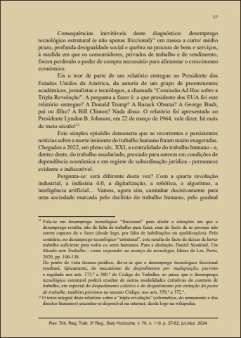 57Rev. Trib. Reg. Trab. 3ª Reg., Belo Horizonte, v. 70, n. 110, p. 37-62, jul./dez. 2024Consequências inevitáveis deste diagnóstico: desemprego tecnológico estrutural (e não apenas friccional)12 em massa a curto/ médio prazo, profunda desigualdade social e quebra na procura de bens e serviços, à medida em que os consumidores, privados de trabalho e de rendimento, forem perdendo o poder de compra necessário para alimentar o crescimento económico.Eis o teor de parte de um relatório entregue ao Presidente dos Estados Unidos da América, da autoria de um grupo de proeminentes académicos, jornalistas e tecnólogos, a chamada “Comissão Ad Hoc sobre a Tripla Revolução”. A pergunta a fazer é: a que presidente dos EUA foi este relatório entregue? A Donald Trump? A Barack Obama? A George Bush, pai ou filho? A Bill Clinton? Nada disso. O relatório foi apresentado ao Presidente Lyndon B. Johnson, em 22 de março de 1964, vale dizer, há mais de meio século!13Este simples episódio demonstra que as recorrentes e persistentes notícias sobre a morte iminente do trabalho humano foram muito exageradas. Chegados a 2022, em pleno séc. XXI, a centralidade do trabalho humano - e, dentro deste, do trabalho assalariado, prestado para outrem em condições de dependência económica e em regime de subordinação jurídica - permanece evidente e indiscutível.Pergunta-se: será diferente desta vez? Com a quarta revolução industrial, a indústria 4.0, a digitalização, a robótica, o algoritmo, a inteligência artificial… Vamos, agora sim, caminhar decisivamente para uma sociedade marcada pelo declínio do trabalho humano, pelo gradual 12 Fala-se em desemprego tecnológico “friccional” para aludir a situações em que o desemprego resulta, não de falta de trabalho para fazer, mas do facto de as pessoas não serem capazes de o fazer (desde logo, por falta de habilitações ou qualifi cações). Pelo contrário, no desemprego tecnológico “estrutural”, este resulta do facto de deixar de haver trabalho sufi ciente para todos os seres humanos. Para a distinção, Daniel Susskind, Um Mundo sem Trabalho - como responder ao avanço da tecnologia, Ideias de Ler, Porto, 2020, pp. 106-138. Do ponto de vista técnico-jurídico, dir-se-ia que o desemprego tecnológico friccional resultará, tipicamente, do mecanismo do despedimento por inadaptação, previsto e regulado nos arts. 373.º a 380.º do Código do Trabalho, ao passo que o desemprego tecnológico estrutural poderá resultar de outras modalidades extintivas do contrato de trabalho, em especial do despedimento coletivo e do despedimento por extinção do posto de trabalho, também previstos no mesmo Código, nos arts. 359.º a 372.º. 13 O texto integral deste relatório sobre a “tripla revolução” (cibernética, do armamento e dos direitos humanos) encontra-se disponível na internet, desde logo na wikipedia.