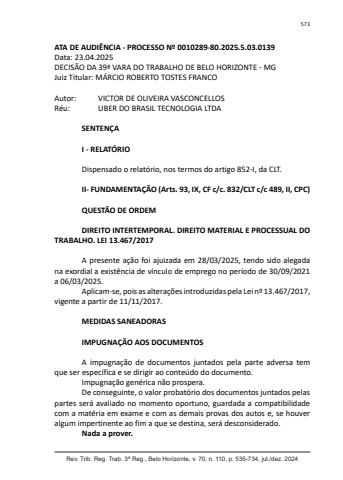 Rev. Trib. Reg. Trab. 3ª Reg., Belo Horizonte, v. 70, n. 110, p. 535-734, jul./dez. 2024573ATA DE AUDIÊNCIA - PROCESSO Nº 0010289-80.2025.5.03.0139Data: 23.04.2025DECISÃO DA 39ª VARA DO TRABALHO DE BELO HORIZONTE - MGJuiz Titular: MÁRCIO ROBERTO TOSTES FRANCOAutor: VICTOR DE OLIVEIRA VASCONCELLOSRéu: UBER DO BRASIL TECNOLOGIA LTDASENTENÇAI - RELATÓRIODispensado o relatório, nos termos do artigo 852-I, da CLT.II- FUNDAMENTAÇÃO (Arts. 93, IX, CF c/c. 832/CLT c/c 489, II, CPC)QUESTÃO DE ORDEMDIREITO INTERTEMPORAL. DIREITO MATERIAL E PROCESSUAL DO TRABALHO. LEI 13.467/2017A presente ação foi ajuizada em 28/03/2025, tendo sido alegada na exordial a existência de vínculo de emprego no período de 30/09/2021 a 06/03/2025.Aplicam-se, pois as alterações introduzidas pela Lei nº 13.467/2017, vigente a partir de 11/11/2017.MEDIDAS SANEADORASIMPUGNAÇÃO AOS DOCUMENTOSA impugnação de documentos juntados pela parte adversa tem que ser específica e se dirigir ao conteúdo do documento.Impugnação genérica não prospera.De conseguinte, o valor probatório dos documentos juntados pelas partes será avaliado no momento oportuno, guardada a compatibilidade com a matéria em exame e com as demais provas dos autos e, se houver algum impertinente ao fim a que se destina, será desconsiderado.Nada a prover.
