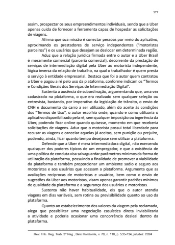 Rev. Trib. Reg. Trab. 3ª Reg., Belo Horizonte, v. 70, n. 110, p. 535-734, jul./dez. 2024577assim, prospectar os seus empreendimentos individuais, sendo que a Uber apenas cuida de fornecer a ferramenta capaz de hospedar as solicitações de viagens.Afirma que sua missão é conectar pessoas por meio do aplicativo, aproximando os prestadores de serviço independentes (“motoristas parceiros”) e os usuários que desejam se deslocar em determinada região.Aduz que a relação jurídica firmada entre o autor e a Uber Brasil é meramente comercial (parceria comercial), decorrente da prestação de serviços de intermediação digital pela Uber ao motorista independente, lógica inversa da relação de trabalho, na qual o trabalhador é quem presta o serviço à entidade empresarial. Destaca que foi o autor quem contratou a Uber e pagou a ré pelo uso da plataforma, conforme indicam os “Termos e Condições Gerais dos Serviços de Intermediação Digital”.Sustenta a ausência de subordinação, argumentando que, uma vez cadastrado na plataforma, o que era realizado sem qualquer seleção ou entrevista, bastando, por imperativo da legislação de trânsito, o envio de CNH e documento do carro a ser utilizado, além do aceite às condições dos “Termos de Uso”, o autor escolhia onde, quando e como utilizaria o aplicativo disponibilizado pela ré, sem qualquer imposição ou ingerência da Uber, podendo ficar online quando quisesse, momento em que receberia solicitações de viagens. Aduz que o motorista possui total liberdade para recusar as viagens e cancelar aquelas já aceitas, sem punição ou prejuízo, podendo, ainda, ficar quanto tempo desejasse sem utilizar a plataforma.Defende que a Uber é mera intermediadora digital, não exercendo quaisquer dos poderes típicos de um empregador, e que a existência de uma política de conduta visa salvaguardar parâmetros mínimos da forma de utilização da plataforma, possuindo a finalidade de promover a viabilidade da plataforma e também proporcionar um ambiente sadio e seguro aos motoristas e aos usuários que acessam a plataforma. Argumenta que as avaliações recíprocas de motoristas e usuários, bem como o envio de sugestões da Uber aos motoristas, visam apenas garantir padrões mínimos de qualidade da plataforma e a segurança dos usuários e motoristas.Sustenta não haver habitualidade, eis que o autor atendia viagens em dias variáveis, sem rotina ou previsibilidade quanto ao uso da plataforma.Quanto ao estabelecimento dos valores da viagem pela reclamada, alega que possibilitar uma negociação casuística direta inviabilizaria a atividade e poderia ocasionar uma concorrência desleal dentro da plataforma.
