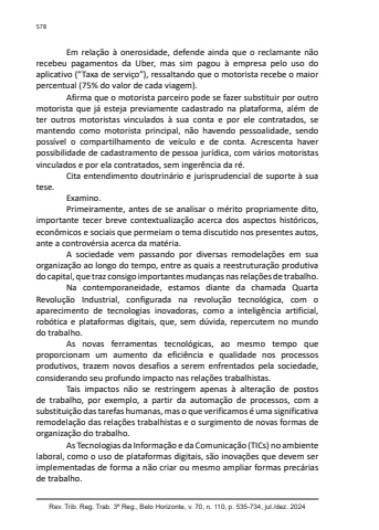 Rev. Trib. Reg. Trab. 3ª Reg., Belo Horizonte, v. 70, n. 110, p. 535-734, jul./dez. 2024578Em relação à onerosidade, defende ainda que o reclamante não recebeu pagamentos da Uber, mas sim pagou à empresa pelo uso do aplicativo (“Taxa de serviço”), ressaltando que o motorista recebe o maior percentual (75% do valor de cada viagem).Afirma que o motorista parceiro pode se fazer substituir por outro motorista que já esteja previamente cadastrado na plataforma, além de ter outros motoristas vinculados à sua conta e por ele contratados, se mantendo como motorista principal, não havendo pessoalidade, sendo possível o compartilhamento de veículo e de conta. Acrescenta haver possibilidade de cadastramento de pessoa jurídica, com vários motoristas vinculados e por ela contratados, sem ingerência da ré.Cita entendimento doutrinário e jurisprudencial de suporte à sua tese.Examino.Primeiramente, antes de se analisar o mérito propriamente dito, importante tecer breve contextualização acerca dos aspectos históricos, econômicos e sociais que permeiam o tema discutido nos presentes autos, ante a controvérsia acerca da matéria.A sociedade vem passando por diversas remodelações em sua organização ao longo do tempo, entre as quais a reestruturação produtiva do capital, que traz consigo importantes mudanças nas relações de trabalho.Na contemporaneidade, estamos diante da chamada Quarta Revolução Industrial, configurada na revolução tecnológica, com o aparecimento de tecnologias inovadoras, como a inteligência artificial, robótica e plataformas digitais, que, sem dúvida, repercutem no mundo do trabalho.As novas ferramentas tecnológicas, ao mesmo tempo que proporcionam um aumento da eficiência e qualidade nos processos produtivos, trazem novos desafios a serem enfrentados pela sociedade, considerando seu profundo impacto nas relações trabalhistas.Tais impactos não se restringem apenas à alteração de postos de trabalho, por exemplo, a partir da automação de processos, com a substituição das tarefas humanas, mas o que verificamos é uma significativa remodelação das relações trabalhistas e o surgimento de novas formas de organização do trabalho.As Tecnologias da Informação e da Comunicação (TICs) no ambiente laboral, como o uso de plataformas digitais, são inovações que devem ser implementadas de forma a não criar ou mesmo ampliar formas precárias de trabalho.