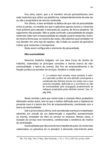 Rev. Trib. Reg. Trab. 3ª Reg., Belo Horizonte, v. 70, n. 110, p. 535-734, jul./dez. 2024581Fica claro, assim, que a ré mantém vínculo personalíssimo com cada motorista que utiliza sua plataforma, independentemente de este ser ou não o proprietário do veículo conduzido.Por último, a tese ventilada na defesa de que não há pessoalidade entre as partes, na medida em que o aplicativo apenas aciona o motorista mais próximo para atender à demanda do usuário, de forma aleatória. Tal argumento não procede. Não se pode confundir a pessoalidade da relação motorista-Uber com a impessoalidade da relação usuário-motorista. Assim, da mesma forma que, na maioria das vezes, não sabemos qual vendedor irá nos atender em uma loja de sapatos, não é dado ao usuário do aplicativo indicar qual motorista o transportará.Resta assim configurado o elemento da pessoalidade.Não eventualidadeMauricio Godinho Delgado, em sua obra Curso de direito do trabalho, sistematiza os principais conceitos e teorias acerca da nãoeventualidade: a teoria do evento, dos fins do empreendimento e da fixação jurídica ao tomador de serviços. Pondera o citado autor:“(...) a conduta mais sensata, nesse contexto, é valerse o operador jurídico de uma aferição convergente e combinada das distintas teorias em cotejo com o caso concreto estudado, definindo-se a ocorrência ou não de eventualidade pela conjugação predominante de enfoques propiciados pelas distintas teorias.” (op. cit.pág.304).Neste sentido e pelo que revela todo o contexto fático probatório delineado nestes autos, tem-se que a melhor definição para a hipótese do presente caso é a teoria dos fins do empreendimento, combinada com a teoria da eventualidade.Sob o prisma dessa última, será considerado eventual o trabalhador admitido em virtude de um determinado e específico acontecimento ou evento, ensejador de obra ou serviço na empresa. Nesses casos, a duração do serviço será transitória, condicionada a existência do motivo da contratação.Eventualidade que não caracteriza o trabalho do autor. Os motoristas cadastrados no aplicativo da ré atendem à demanda intermitente pelos