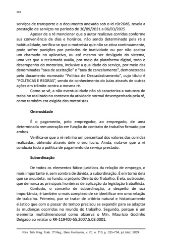 Rev. Trib. Reg. Trab. 3ª Reg., Belo Horizonte, v. 70, n. 110, p. 535-734, jul./dez. 2024582serviços de transporte e o documento anexado sob o Id c0c26d8, revela a prestação de serviços no período de 30/09/2021 a 06/03/2025.Apesar de a ré mencionar que o autor realizava corridas conforme sua conveniência de dias e horários, não sendo determinado pela ré a habitualidade, verifica-se que o motorista que não se ativa continuamente, pode sofrer punições por períodos de inatividade ou por não aceitar um chamado no aplicativo, ou até mesmo ser desligado do sistema, uma vez que a reclamada avalia, por meio da plataforma digital, todo o desempenho do motorista, inclusive a qualidade do serviço, por meio das denominadas “taxa de aceitação” e “taxa de cancelamento”, demonstradas pelo documento nomeado “Política de Descadastramento”, cujo título é “POLÍTICAS E REGRAS”, sendo de conhecimento do Juízo através de outras ações em trâmite contra a mesma ré.Como se vê, a não-eventualidade não só caracteriza a natureza do trabalho realizado no contexto da atividade normal desempenhada pela ré, como também era exigida dos motoristas.OnerosidadeÉ o pagamento, pelo empregador, ao empregado, de uma determinada remuneração em função do contrato de trabalho firmado por ambos.Verifica-se que a ré retinha um percentual dos valores das corridas realizadas, obtendo através dele o seu lucro. Ainda, nota-se que a ré conduzia toda a política de pagamento do serviço prestado.SubordinaçãoDe todos os elementos fático-jurídicos da relação de emprego, o mais importante é, sem sombra de dúvida, a subordinação. É em torno dela que se arquiteta, no fundo, o próprio Direito do Trabalho. É ela, outrossim, que demarca as principais fronteiras de aplicação da legislação trabalhista.Contudo, o conceito de subordinação, a despeito de sua importância, é também o mais complexo de se identificar em uma relação de trabalho. Primeiro, por se tratar de critério natural e historicamente elástico que com o passar do tempo precisou se expandir para se adaptar às mudanças ocorridas no mundo do trabalho. Segundo, porque é um elemento multidimensional como observa o Min. Mauricio Godinho Delgado ao relatar o RR-119400-55.2007.5.03.0001: