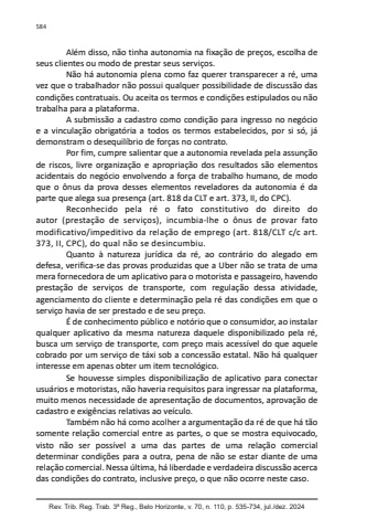 Rev. Trib. Reg. Trab. 3ª Reg., Belo Horizonte, v. 70, n. 110, p. 535-734, jul./dez. 2024584Além disso, não tinha autonomia na fixação de preços, escolha de seus clientes ou modo de prestar seus serviços.Não há autonomia plena como faz querer transparecer a ré, uma vez que o trabalhador não possui qualquer possibilidade de discussão das condições contratuais. Ou aceita os termos e condições estipulados ou não trabalha para a plataforma.A submissão a cadastro como condição para ingresso no negócio e a vinculação obrigatória a todos os termos estabelecidos, por si só, já demonstram o desequilíbrio de forças no contrato.Por fim, cumpre salientar que a autonomia revelada pela assunção de riscos, livre organização e apropriação dos resultados são elementos acidentais do negócio envolvendo a força de trabalho humano, de modo que o ônus da prova desses elementos reveladores da autonomia é da parte que alega sua presença (art. 818 da CLT e art. 373, II, do CPC).Reconhecido pela ré o fato constitutivo do direito do autor (prestação de serviços), incumbia-lhe o ônus de provar fato modificativo/impeditivo da relação de emprego (art. 818/CLT c/c art. 373, II, CPC), do qual não se desincumbiu.Quanto à natureza jurídica da ré, ao contrário do alegado em defesa, verifica-se das provas produzidas que a Uber não se trata de uma mera fornecedora de um aplicativo para o motorista e passageiro, havendo prestação de serviços de transporte, com regulação dessa atividade, agenciamento do cliente e determinação pela ré das condições em que o serviço havia de ser prestado e de seu preço.É de conhecimento público e notório que o consumidor, ao instalar qualquer aplicativo da mesma natureza daquele disponibilizado pela ré, busca um serviço de transporte, com preço mais acessível do que aquele cobrado por um serviço de táxi sob a concessão estatal. Não há qualquer interesse em apenas obter um item tecnológico.Se houvesse simples disponibilização de aplicativo para conectar usuários e motoristas, não haveria requisitos para ingressar na plataforma, muito menos necessidade de apresentação de documentos, aprovação de cadastro e exigências relativas ao veículo.Também não há como acolher a argumentação da ré de que há tão somente relação comercial entre as partes, o que se mostra equivocado, visto não ser possível a uma das partes de uma relação comercial determinar condições para a outra, pena de não se estar diante de uma relação comercial. Nessa última, há liberdade e verdadeira discussão acerca das condições do contrato, inclusive preço, o que não ocorre neste caso.