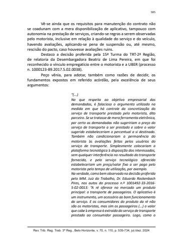 Rev. Trib. Reg. Trab. 3ª Reg., Belo Horizonte, v. 70, n. 110, p. 535-734, jul./dez. 2024585Vê-se ainda que os requisitos para manutenção do contrato não se coadunam com a mera disponibilização de aplicativo, tampouco com autonomia na prestação de serviços, criando-se regras a serem observadas pelo motorista, inclusive em relação à qualidade do serviço e do veículo, havendo avaliações, aplicando-se pena de suspensão ou, até mesmo, rescisão do pacto, caso houvesse avaliações ruins.Destaco a decisão proferida pela 15ª Turma do TRT-2ª Região, de relatoria da Desembargadora Beatriz de Lima Pereira, em que foi reconhecido o vínculo empregatício entre o motorista e a UBER (processo n. 1000123-89.2017.5.02.0038).Peço vênia, para adotar, também como razões de decidir, os fundamentos expostos em referido acórdão, pela excelência de seus argumentos:“(...)No que respeita ao objetivo empresarial das demandadas, é falacioso o argumento utilizado na medida em que há controle da concretização do serviço de transporte prestado pelo motorista, dito parceiro. Se se tratasse de mera ferramenta eletrônica, por certo as demandadas não sugeririam o preço do serviço de transporte a ser prestado e sobre o valor sugerido estabeleceriam o percentual a si destinado. Também não condicionariam a permanência do motorista às avaliações feitas pelos usuários do serviço de transporte. Simplesmente colocariam a plataforma tecnológica à disposição dos interessados, sem qualquer interferência no resultado do transporte fornecido, e pelo serviço tecnológico oferecido estabeleceriam um preço/valor fixo a ser pago pelo motorista pelo tempo de utilização, por exemplo.Na verdade, como bem observado na decisão proferida pelo MM. Juiz do Trabalho, Dr. Eduardo Rockenbach Pires, nos autos do processo n.º 1001492-33-2016-5-02-0013: “A ré oferece no mercado um produto principal: o transporte de passageiros. O aplicativo éum instrumento, um acessório ao bom funcionamento do serviço. E os consumidores do produto da ré não são os motoristas, mas sim os passageiros (...) o valor que cabe à empresa é extraído do serviço de transporte prestado ao consumidor passageiro. Logo, como o