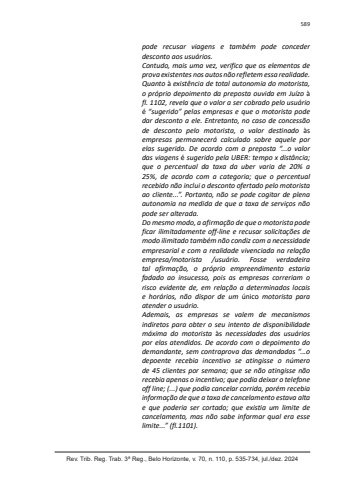 Rev. Trib. Reg. Trab. 3ª Reg., Belo Horizonte, v. 70, n. 110, p. 535-734, jul./dez. 2024589pode recusar viagens e também pode conceder desconto aos usuários.Contudo, mais uma vez, verifico que os elementos de prova existentes nos autos não refletem essa realidade.Quanto à existência de total autonomia do motorista, o próprio depoimento da preposta ouvida em Juízo àfl. 1102, revela que o valor a ser cobrado pelo usuário é “sugerido” pelas empresas e que o motorista pode dar desconto a ele. Entretanto, no caso de concessão de desconto pelo motorista, o valor destinado àsempresas permanecerá calculado sobre aquele por elas sugerido. De acordo com a preposta “...o valor das viagens é sugerido pela UBER: tempo x distância; que o percentual da taxa da uber varia de 20% a 25%, de acordo com a categoria; que o percentual recebido não inclui o desconto ofertado pelo motorista ao cliente...”. Portanto, não se pode cogitar de plena autonomia na medida de que a taxa de serviços não pode ser alterada.Do mesmo modo, a afirmação de que o motorista pode ficar ilimitadamente off-line e recusar solicitações de modo ilimitado também não condiz com a necessidade empresarial e com a realidade vivenciada na relação empresa/motorista /usuário. Fosse verdadeira tal afirmação, o próprio empreendimento estaria fadado ao insucesso, pois as empresas correriam o risco evidente de, em relação a determinados locais e horários, não dispor de um único motorista para atender o usuário.Ademais, as empresas se valem de mecanismos indiretos para obter o seu intento de disponibilidade máxima do motorista às necessidades dos usuários por elas atendidos. De acordo com o depoimento do demandante, sem contraprova das demandadas “...o depoente recebia incentivo se atingisse o número de 45 clientes por semana; que se não atingisse não recebia apenas o incentivo; que podia deixar o telefone off line; (...) que podia cancelar corrida, porém recebia informação de que a taxa de cancelamento estava alta e que poderia ser cortado; que existia um limite de cancelamento, mas não sabe informar qual era esse limite...” (fl.1101).