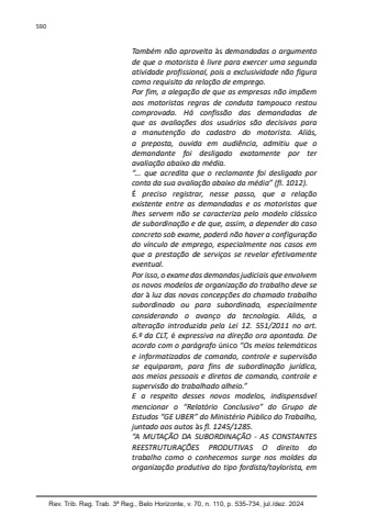 Rev. Trib. Reg. Trab. 3ª Reg., Belo Horizonte, v. 70, n. 110, p. 535-734, jul./dez. 2024590Também não aproveita às demandadas o argumento de que o motorista é livre para exercer uma segunda atividade profissional, pois a exclusividade não figura como requisito da relação de emprego.Por fim, a alegação de que as empresas não impõem aos motoristas regras de conduta tampouco restou comprovada. Há confissão das demandadas de que as avaliações dos usuários são decisivas para a manutenção do cadastro do motorista. Aliás, a preposta, ouvida em audiência, admitiu que o demandante foi desligado exatamente por ter avaliação abaixo da média.“... que acredita que o reclamante foi desligado por conta da sua avaliação abaixo da média” (fl. 1012).É preciso registrar, nesse passo, que a relação existente entre as demandadas e os motoristas que lhes servem não se caracteriza pelo modelo clássico de subordinação e de que, assim, a depender do caso concreto sob exame, poderá não haver a configuração do vínculo de emprego, especialmente nos casos em que a prestação de serviços se revelar efetivamente eventual.Por isso, o exame das demandas judiciais que envolvem os novos modelos de organização do trabalho deve se dar à luz das novas concepções do chamado trabalho subordinado ou para subordinado, especialmente considerando o avanço da tecnologia. Aliás, a alteração introduzida pela Lei 12. 551/2011 no art. 6.º da CLT, é expressiva na direção ora apontada. De acordo com o parágrafo único “Os meios telemáticos e informatizados de comando, controle e supervisão se equiparam, para fins de subordinação jurídica, aos meios pessoais e diretos de comando, controle e supervisão do trabalhado alheio.”E a respeito desses novos modelos, indispensável mencionar o “Relatório Conclusivo” do Grupo de Estudos “GE UBER” do Ministério Público do Trabalho, juntado aos autos às fl. 1245/1285.“A MUTAÇÃO DA SUBORDINAÇÃO - AS CONSTANTES REESTRUTURAÇÕES PRODUTIVAS O direito do trabalho como o conhecemos surge nos moldes da organização produtiva do tipo fordista/taylorista, em