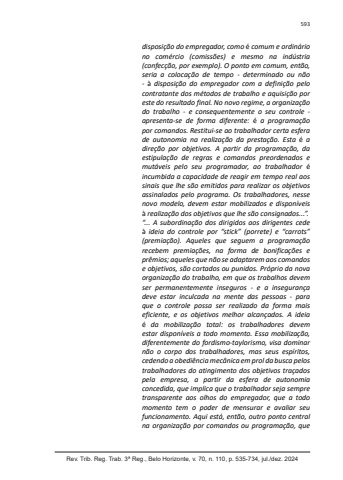 Rev. Trib. Reg. Trab. 3ª Reg., Belo Horizonte, v. 70, n. 110, p. 535-734, jul./dez. 2024593disposição do empregador, como é comum e ordinário no comércio (comissões) e mesmo na indústria (confecção, por exemplo). O ponto em comum, então, seria a colocação de tempo - determinado ou não - à disposição do empregador com a definição pelo contratante dos métodos de trabalho e aquisição por este do resultado final. No novo regime, a organização do trabalho - e consequentemente o seu controle - apresenta-se de forma diferente: é a programação por comandos. Restitui-se ao trabalhador certa esfera de autonomia na realização da prestação. Esta é a direção por objetivos. A partir da programação, da estipulação de regras e comandos preordenados e mutáveis pelo seu programador, ao trabalhador éincumbida a capacidade de reagir em tempo real aos sinais que lhe são emitidos para realizar os objetivos assinalados pelo programa. Os trabalhadores, nesse novo modelo, devem estar mobilizados e disponíveis à realização dos objetivos que lhe são consignados...”.“... A subordinação dos dirigidos aos dirigentes cede à ideia do controle por “stick” (porrete) e “carrots” (premiação). Aqueles que seguem a programação recebem premiações, na forma de bonificações e prêmios; aqueles que não se adaptarem aos comandos e objetivos, são cortados ou punidos. Próprio da nova organização do trabalho, em que os trabalhos devem ser permanentemente inseguros - e a insegurança deve estar inculcada na mente das pessoas - para que o controle possa ser realizado da forma mais eficiente, e os objetivos melhor alcançados. A ideia é da mobilização total: os trabalhadores devem estar disponíveis a todo momento. Essa mobilização, diferentemente do fordismo-taylorismo, visa dominar não o corpo dos trabalhadores, mas seus espíritos, cedendo a obediência mecânica em prol da busca pelos trabalhadores do atingimento dos objetivos traçados pela empresa, a partir da esfera de autonomia concedida, que implica que o trabalhador seja sempre transparente aos olhos do empregador, que a todo momento tem o poder de mensurar e avaliar seu funcionamento. Aqui está, então, outro ponto central na organização por comandos ou programação, que