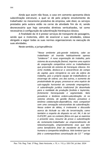 Rev. Trib. Reg. Trab. 3ª Reg., Belo Horizonte, v. 70, n. 110, p. 535-734, jul./dez. 2024596Ainda que assim não fosse, o caso em comento apresenta óbvia subordinação estrutural, a qual se dá pelo próprio envolvimento do trabalhador no mecanismo produtivo da empresa, vale dizer, os serviços prestados pela autora estão no cerne da atividade fim da ré, sendo desnecessário que haja comandos diretivos verticalizados, tal como necessários à configuração da subordinação hierárquica clássica.A finalidade da ré é prestar serviços de transporte de passageiro, sendo que o motorista, além de essencial a suas atividades, estava obrigado a seguir todas as suas normas organizacionais na execução de suas atividades.Neste sentido, a jurisprudência:“Nesse ambiente pós-grande indústria, cabe ao trabalhador ali inserido habitualmente apenas “colaborar”. A nova organização do trabalho, pelo sistema da acumulação flexível, imprime uma espécie de cooperação competitiva entre os trabalhadores que prescinde do sistema de hierarquia clássica. Em certa medida, desloca-se a concorrência do campo do capital, para introjetá-la no seio da esfera do trabalho, pois a própria equipe de trabalhadores se encarrega de cobrar, uns dos outros, o aumento da produtividade do grupo; processa-se uma espécie de sub-rogação horizontal do comando empregatício. A subordinação jurídica tradicional foi desenhada para a realidade da produção fordista e taylorista, fortemente hierarquizada e segmentada. Nela prevalecia o binômio ordem-subordinação. Já no sistema ohnista, de gestão flexível, prevalece o binômio colaboração-dependência, mais compatível com uma concepção estruturalista da subordinação. Nessa ordem de idéias, é irrelevante a discussão acerca da ilicitude ou não da terceirização, como também a respeito do disposto no art. 94, II da Lei 9.472/97, pois no contexto fático em que se examina o presente caso, ressume da prova a subordinação do reclamante-trabalhador ao empreendimento de telecomunicação, empreendimento esse que tem como beneficiário final do excedente do trabalho humano a companhia telefônica. Vale lembrar que na feliz e contemporânea conceituação da CLT “ artigo
