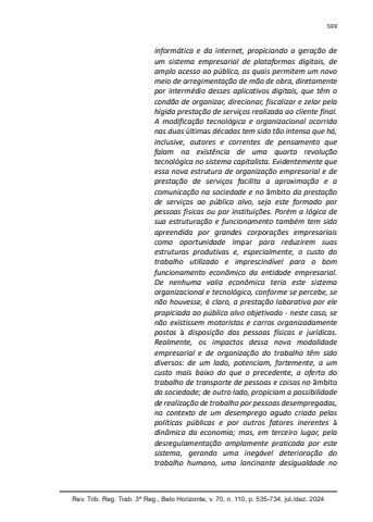 Rev. Trib. Reg. Trab. 3ª Reg., Belo Horizonte, v. 70, n. 110, p. 535-734, jul./dez. 2024599informática e da internet, propiciando a geração de um sistema empresarial de plataformas digitais, de amplo acesso ao público, as quais permitem um novo meio de arregimentação de mão de obra, diretamente por intermédio desses aplicativos digitais, que têm o condão de organizar, direcionar, fiscalizar e zelar pela hígida prestação de serviços realizada ao cliente final. A modificação tecnológica e organizacional ocorrida nas duas últimas décadas tem sido tão intensa que há, inclusive, autores e correntes de pensamento que falam na existência de uma quarta revolução tecnológica no sistema capitalista. Evidentemente que essa nova estrutura de organização empresarial e de prestação de serviços facilita a aproximação e a comunicação na sociedade e no âmbito da prestação de serviços ao público alvo, seja este formado por pessoas físicas ou por instituições. Porém a lógica de sua estruturação e funcionamento também tem sido apreendida por grandes corporações empresariais como oportunidade ímpar para reduzirem suas estruturas produtivas e, especialmente, o custo do trabalho utilizado e imprescindível para o bom funcionamento econômico da entidade empresarial. De nenhuma valia econômica teria este sistema organizacional e tecnológico, conforme se percebe, se não houvesse, é claro, a prestação laborativa por ele propiciada ao público alvo objetivado - neste caso, se não existissem motoristas e carros organizadamente postos à disposição das pessoas físicas e jurídicas. Realmente, os impactos dessa nova modalidade empresarial e de organização do trabalho têm sido diversos: de um lado, potenciam, fortemente, a um custo mais baixo do que o precedente, a oferta do trabalho de transporte de pessoas e coisas no âmbitoda sociedade; de outro lado, propiciam a possibilidade de realização de trabalho por pessoas desempregadas, no contexto de um desemprego agudo criado pelas políticas públicas e por outros fatores inerentes àdinâmica da economia; mas, em terceiro lugar, pela desregulamentação amplamente praticada por este sistema, gerando uma inegável deterioração do trabalho humano, uma lancinante desigualdade no