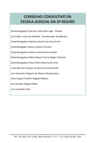 Rev. Trib. Reg. Trab. 3ª Reg., Belo Horizonte, v. 70, n. 110, p. 06-06, jul./dez. 2024Desembargador Emerson José Alves Lage - DiretorJuiz Cleber Lúcio de Almeida - Coordenador AcadêmicoDesembargadora Adriana Goulart de Sena OrsiniDesembargador Marcus Moura FerreiraDesembargadora Maria Cristina Diniz CaixetaDesembargadora Maria Raquel Ferraz Zagari ValentimDesembargadora Taisa Maria Macena de LimaJuíza Adriana Campos de Souza Freire PimentaJuiz Alexandre Wagner de Morais AlbuquerqueJuíza Angela Castilho Rogedo RibeiroJuiz Geraldo Magela MeloJuiz Leonardo TiboCONSELHO CONSULTIVO DAESCOLA JUDICIAL DA 3ª REGIÃO