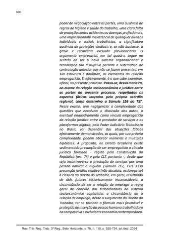 Rev. Trib. Reg. Trab. 3ª Reg., Belo Horizonte, v. 70, n. 110, p. 535-734, jul./dez. 2024600poder de negociação entre as partes, uma ausência de regras de higiene e saúde do trabalho, uma clara falta de proteção contra acidentes ou doenças profissionais, uma impressionante inexistência de quaisquer direitos individuais e sociais trabalhistas, a significativa ausência de proteções sindicais e, se não bastasse, a grave e recorrente exclusão previdenciária. O argumento empresarial, em tal quadro, segue no sentido de ser o novo sistema organizacional e tecnológico tão disruptivo perante a sistemática de contratação anterior que não se fazem presentes, em sua estrutura e dinâmica, os elementos da relação empregatícia. E, efetivamente, é o que cabe examinar, afinal, no presente processo. Passa-se, dessa maneira, ao exame da relação socioeconômica e jurídica entre as partes do presente processo, respeitados os aspectos fáticos lançados pelo próprio acórdão regional, como determina a Súmula 126 do TST. Nesse exame, sem negligenciar a complexidade das questões que envolvem a discussão dos autos, o eventual enquadramento como vínculo empregatício da relação jurídica entre o prestador de serviços e as plataformas digitais, pelo Poder Judiciário Trabalhista no Brasil, vai depender das situações fáticas efetivamente demonstradas, as quais, por sua própria complexidade, podem abarcar inúmeras e múltiplas hipóteses. A propósito, no Direito brasileiro existe sedimentada presunção de ser empregatício o vínculo jurídico formado - regido pela Constituição da República (art. 7º) e pela CLT, portanto -, desde que seja incontroversa a prestação de serviços por uma pessoa natural a alguém (Súmula 212, TST). Essa presunção jurídica relativa (não absoluta, esclareça-se) é clássica ao Direito do Trabalho, em geral, resultando de dois fatores historicamente incontestáveis: a circunstância de ser a relação de emprego a regra geral de conexão dos trabalhadores ao sistema socioeconômico capitalista; a circunstância de a relação de emprego, desde o surgimento do Direito do Trabalho, ter se tornado a fórmula mais favorável e protegida de inserção da pessoa humana trabalhadora na competitiva e excludente economia contemporânea.